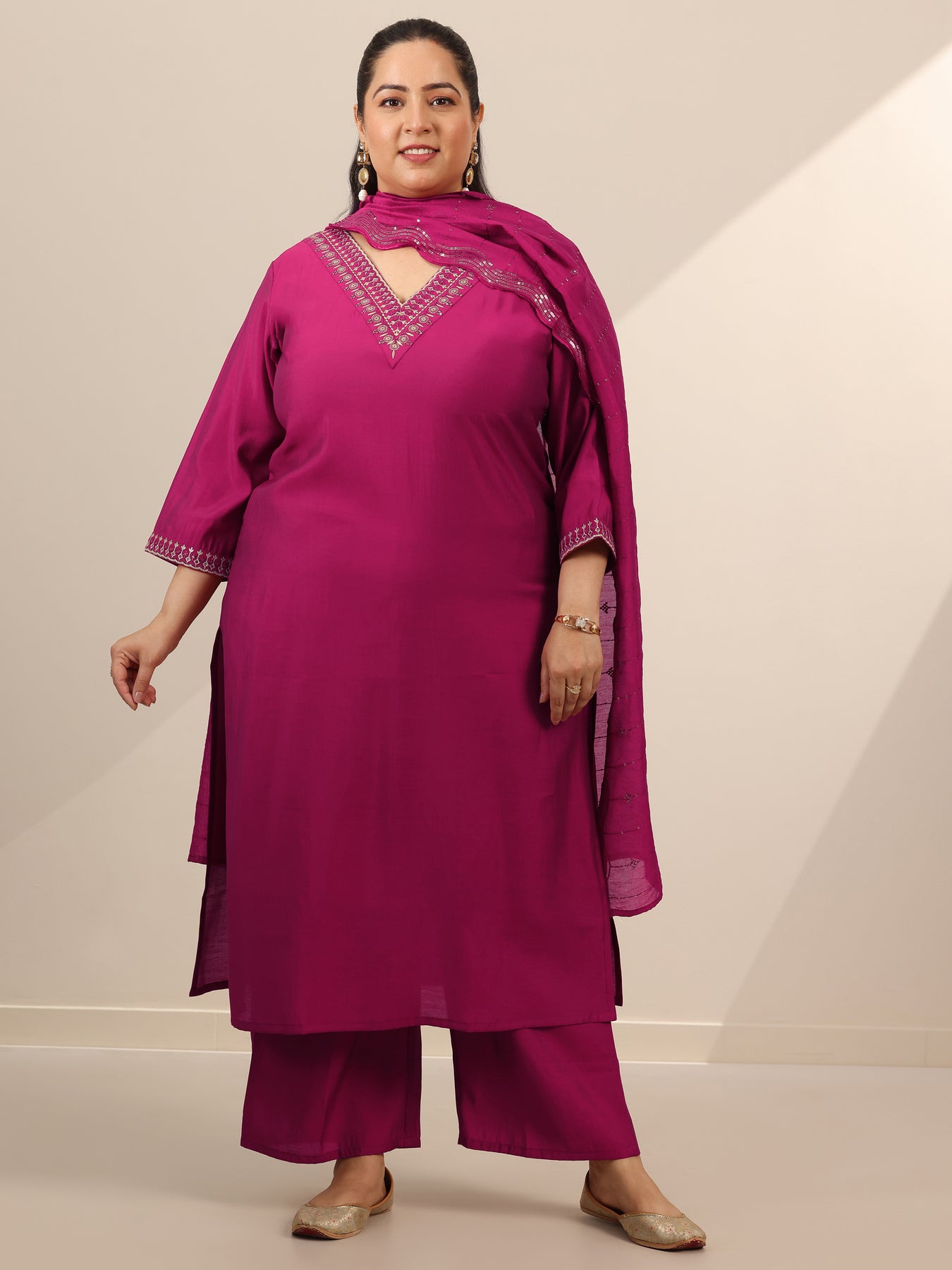 Libas Extra Love collection features our signature designs in comfortable plus sizes. Our 3-piece Magenta Silk Blend Straight-Fit Kurta Set features a Keyhole Neckline, Regular Sleeves, and statement Yoke Design. Complemented with Straight Pants with an Elasticated waistband and 2 pockets, and a Solid dupatta. Adorned with Solid accents, this style is perfect for Dark Festive occasions.