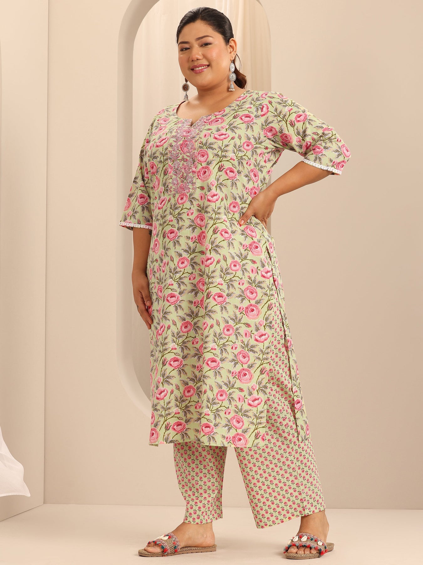 Our 2-piece green cotton blend straight-fit features a round neckline, regular sleeves, and statement yoke. Adorned with floral prints, this style is perfect for casual wear.