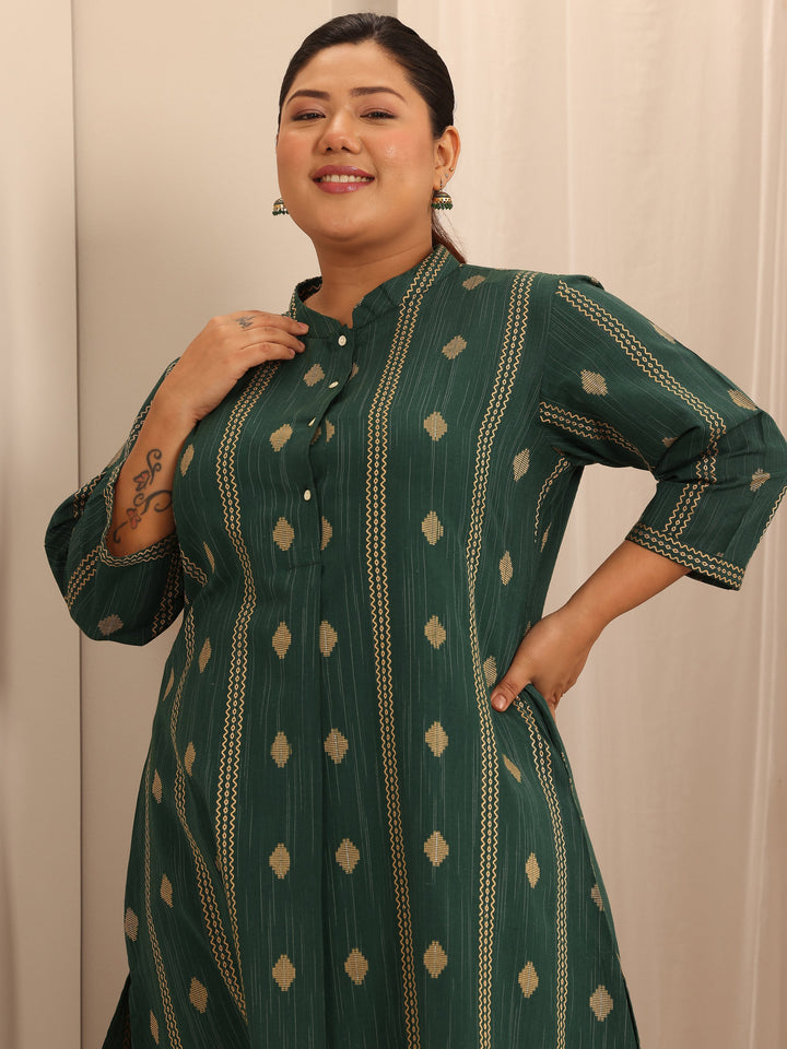 Plus Size Green Woven Design Cotton Blend Straight Kurta Set