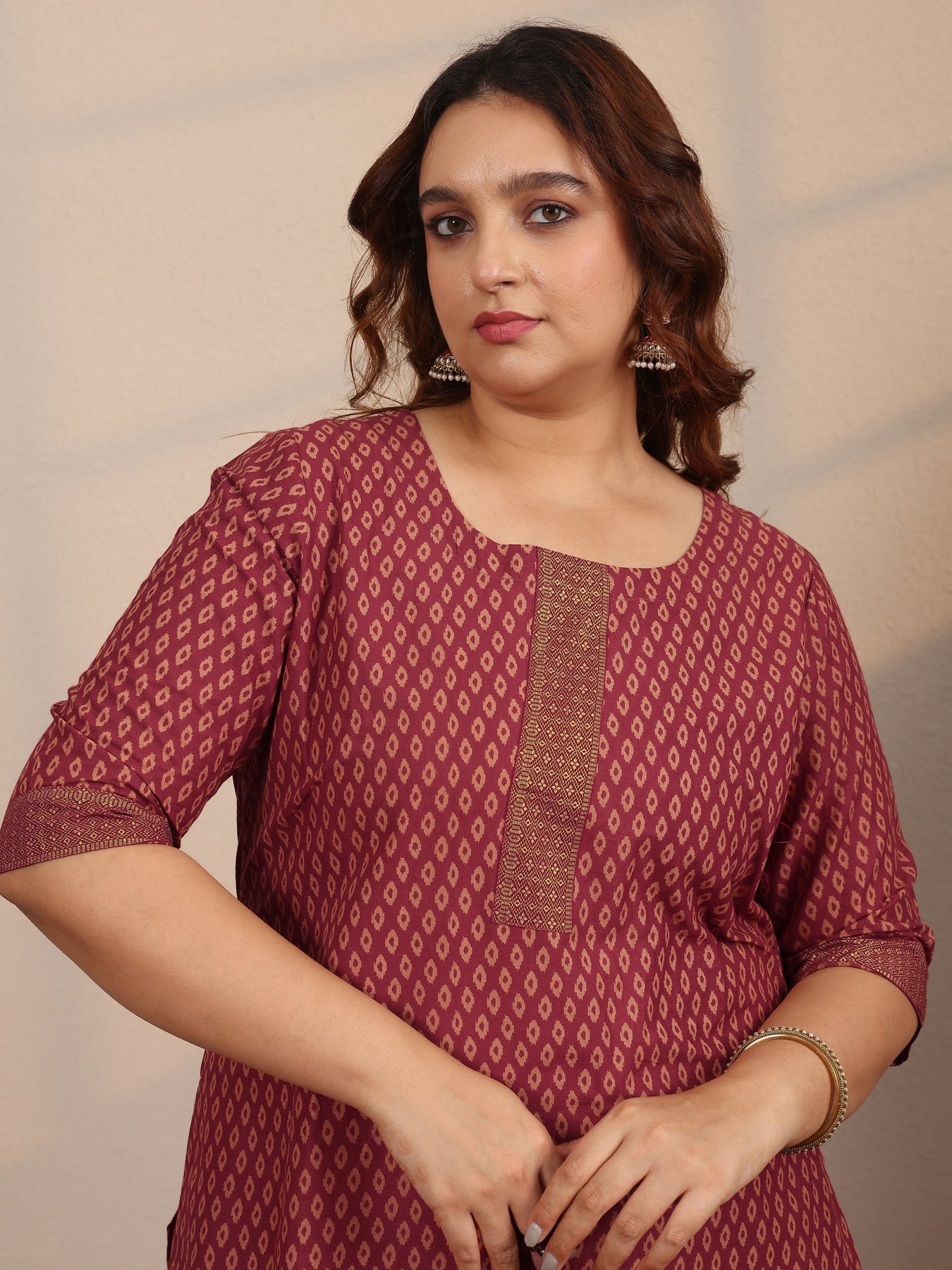 Plus Size Maroon Printed Cotton Straight Suit Set With Dupatta