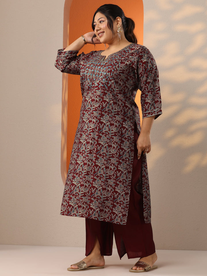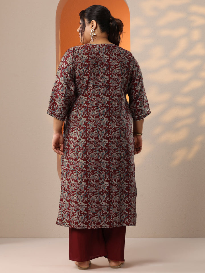 Plus Size Maroon Printed Silk Blend Straight Kurta Set