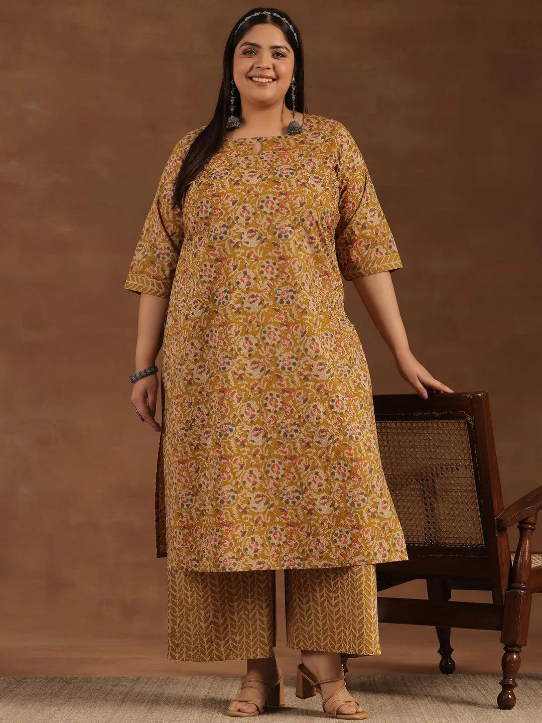 Plus Size Mustard Printed Cotton Straight Kurta Set