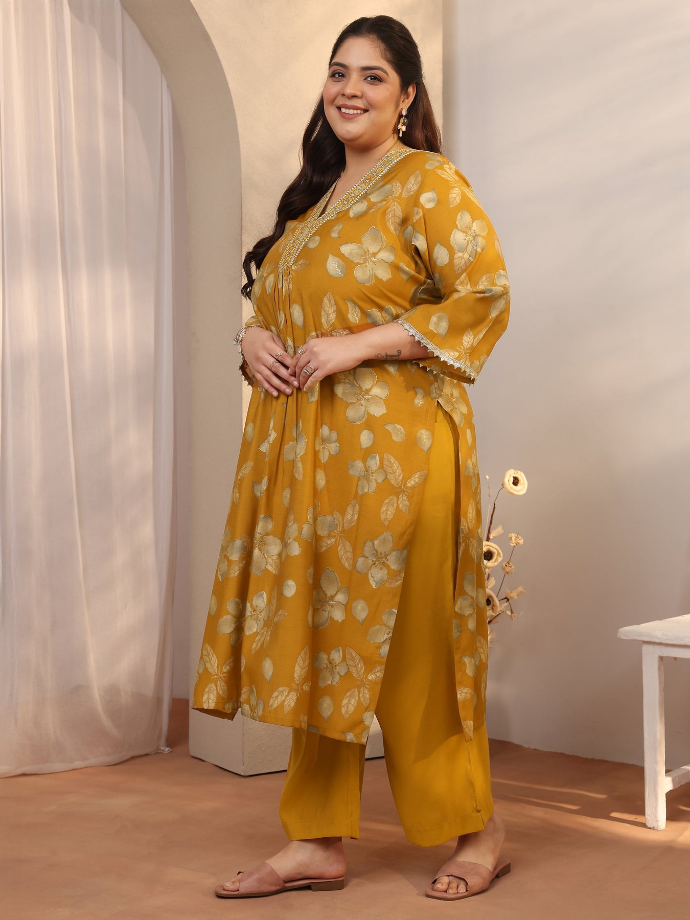 Plus Size Mustard Printed Silk blend Straight Suit Set With Dupatta