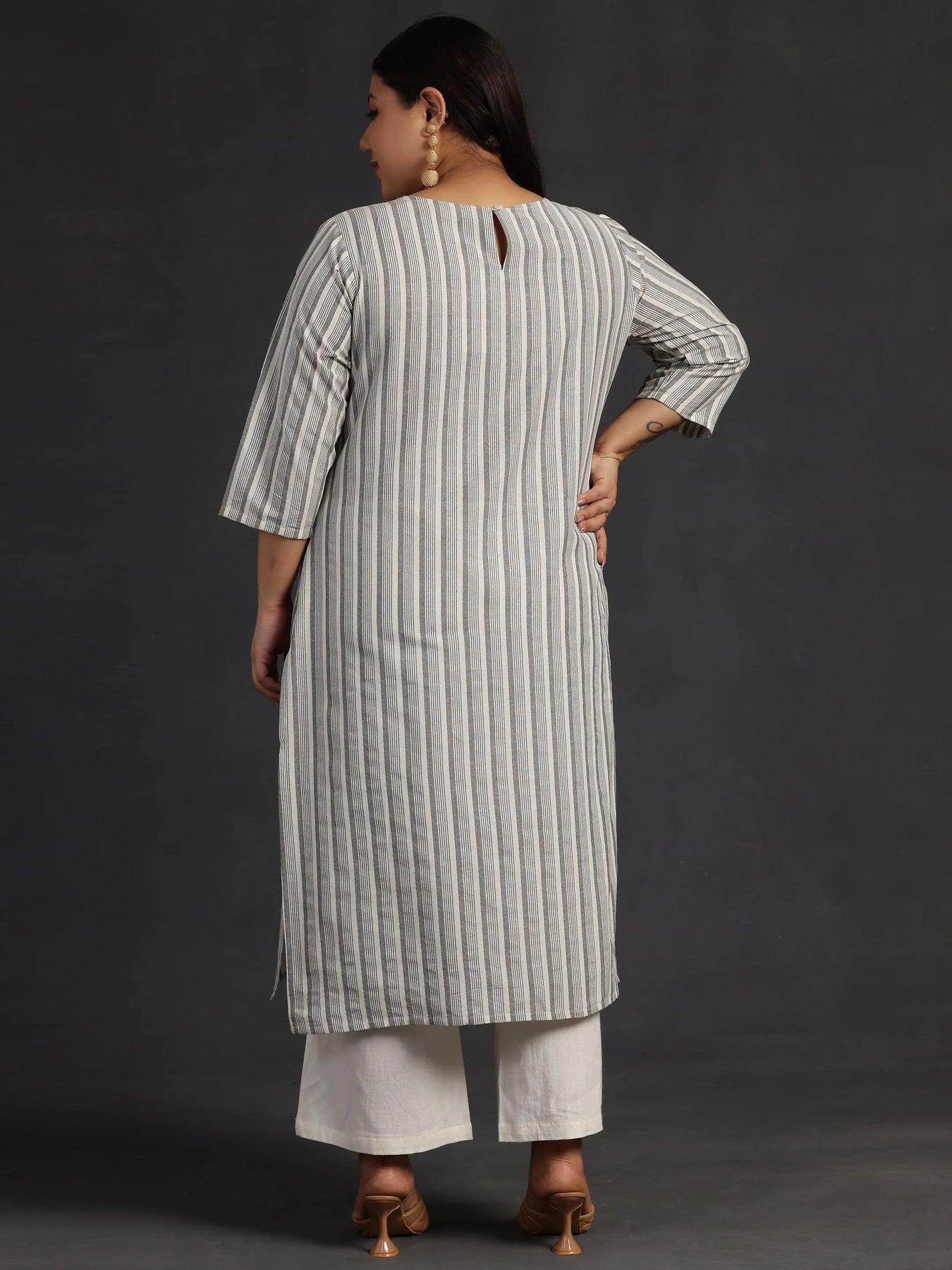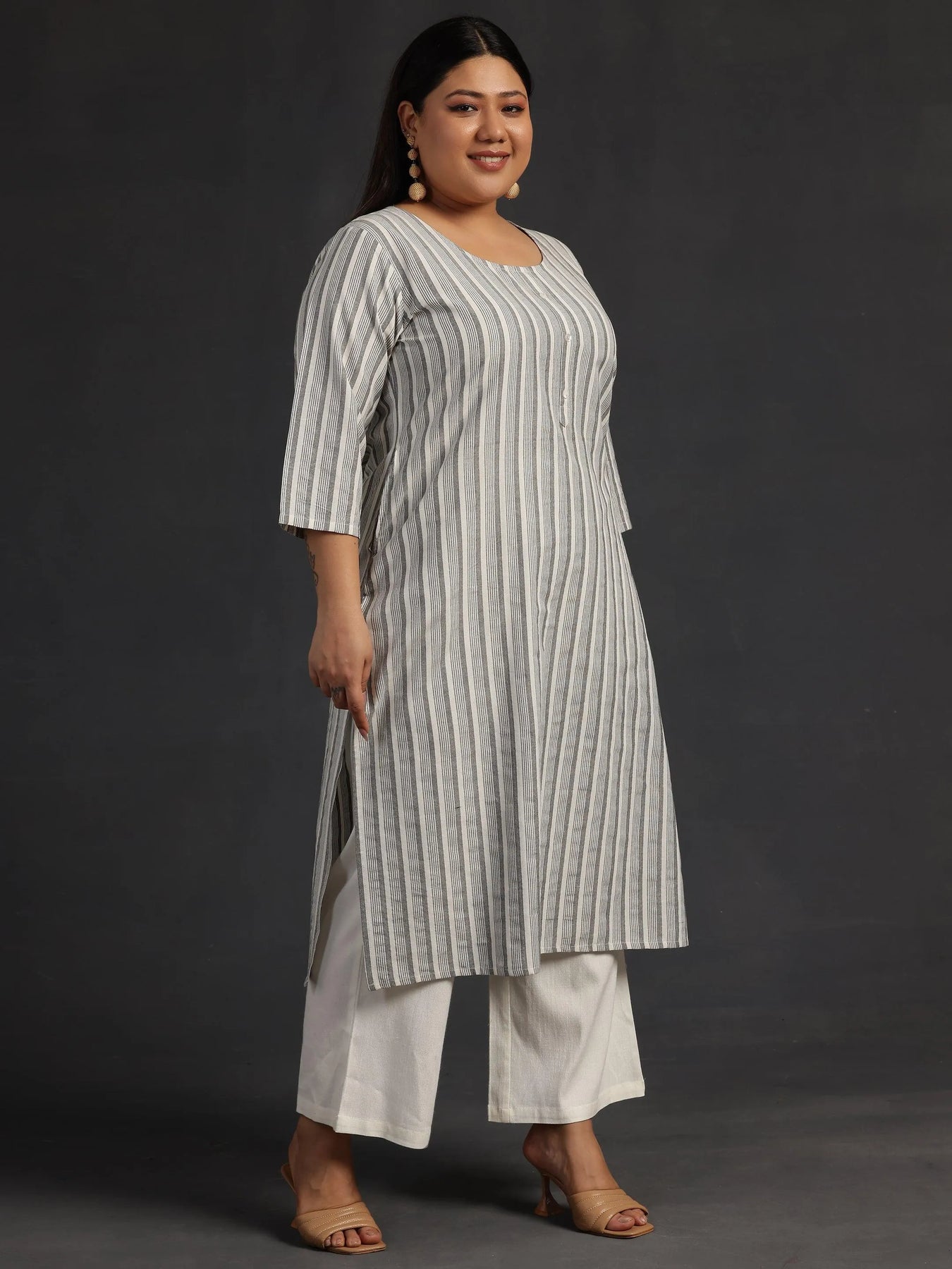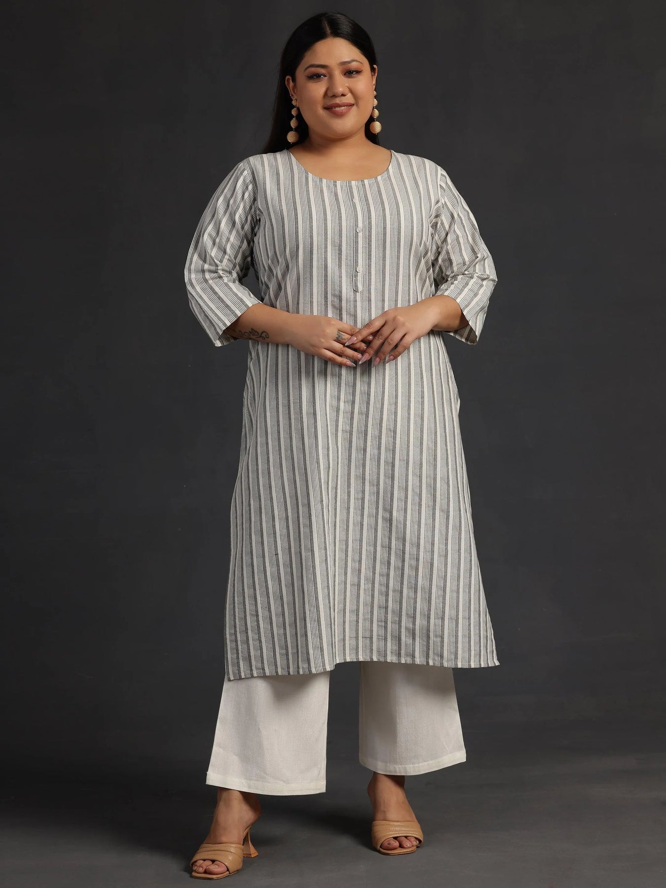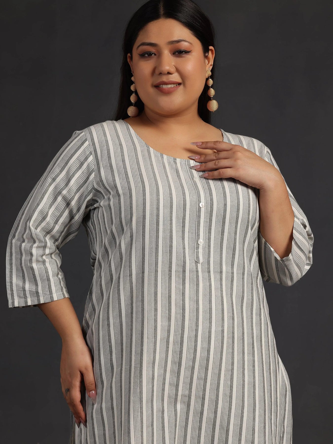 Libas Extra Love collection features our signature designs in comfortable plus sizes. Our white striped straight-fit cotton kurta features a round neckline and three-quarter sleeves. Adorned with stylish buttons, this style is perfect for work and beyond.