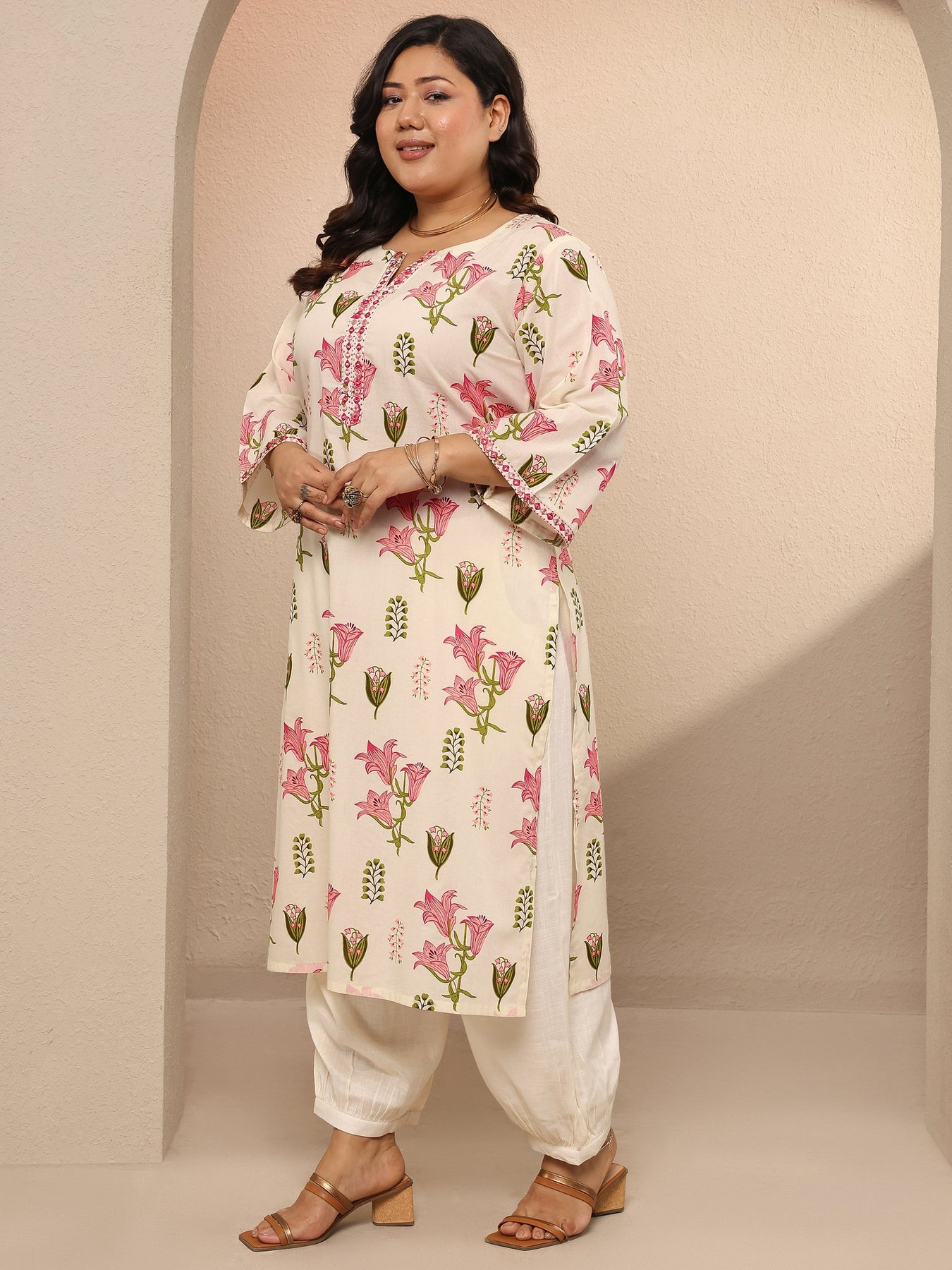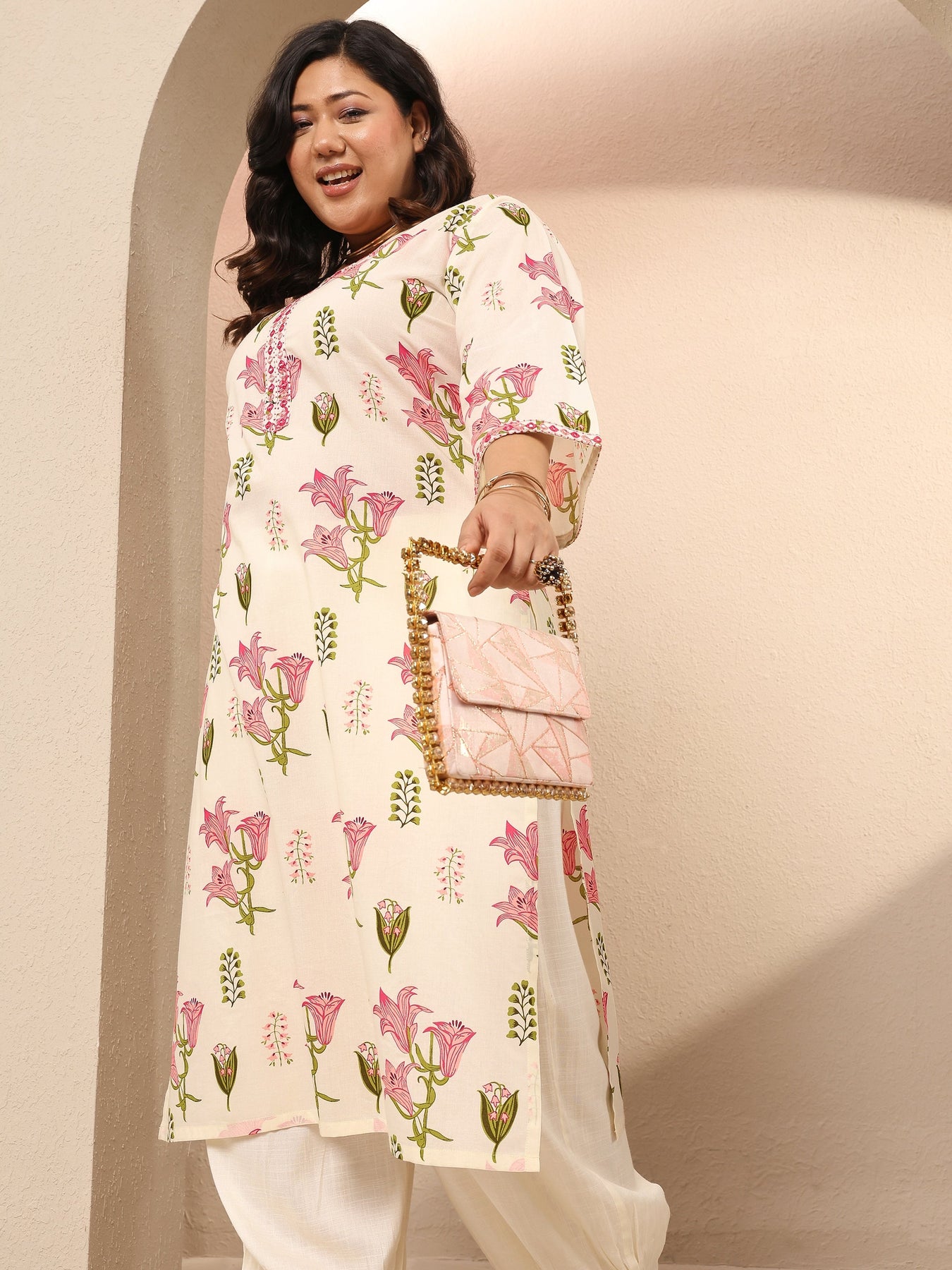 Our 1-piece pink and off-white cotton straight-fit kurta features a V-neckline, bell sleeves, and statement Yoke. Adorned with Floral print, this style is perfect for work wear and casual wear.