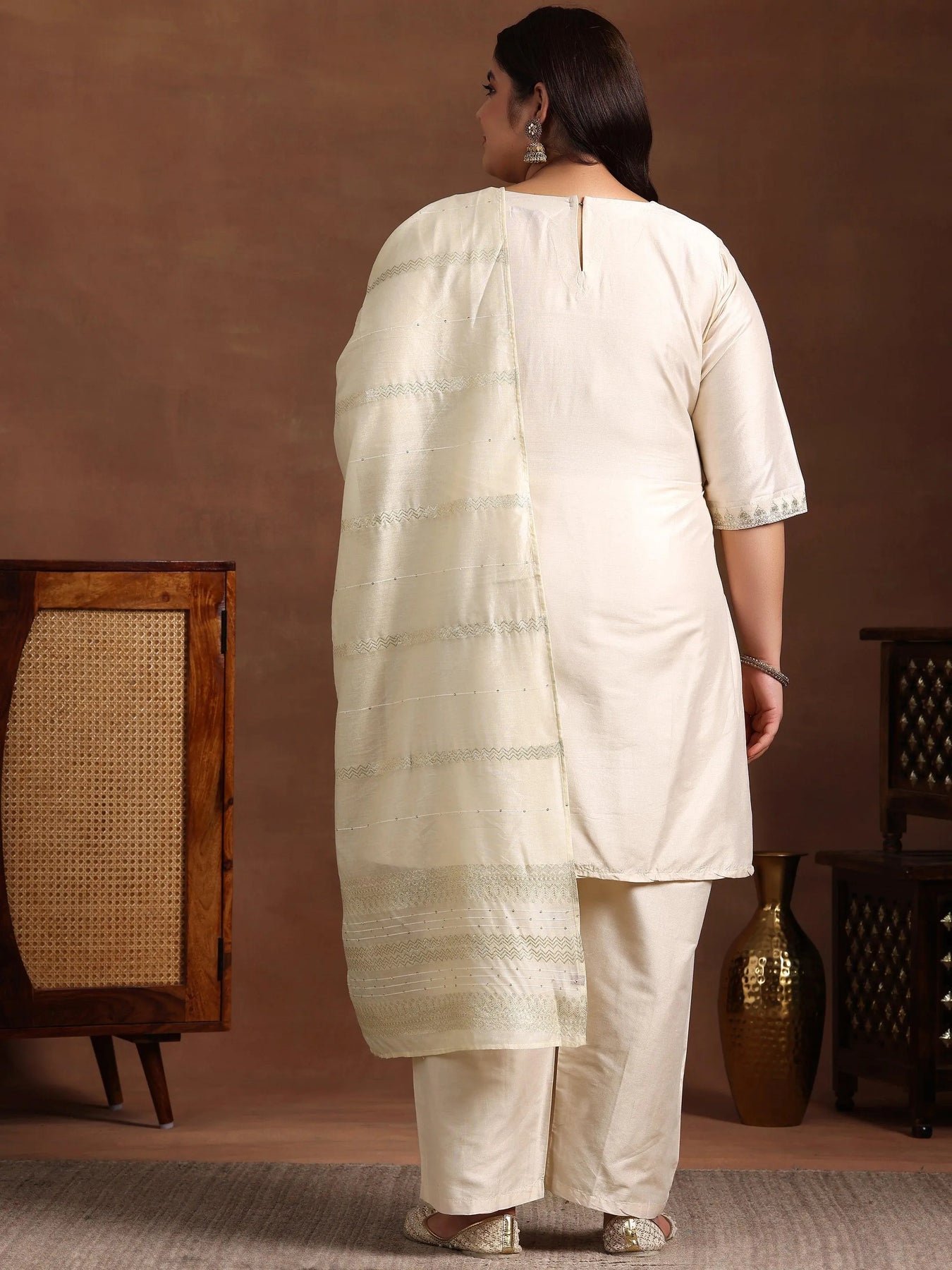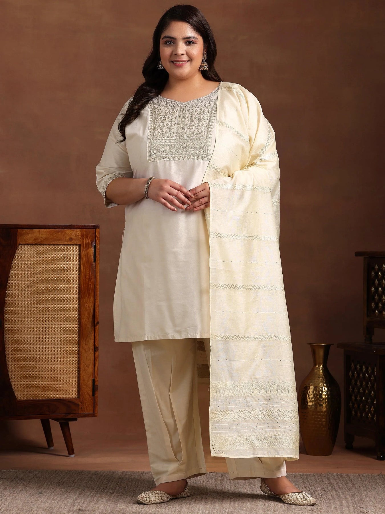 Plus Size Off White Yoke Design Silk Blend Straight Suit With Dupatta