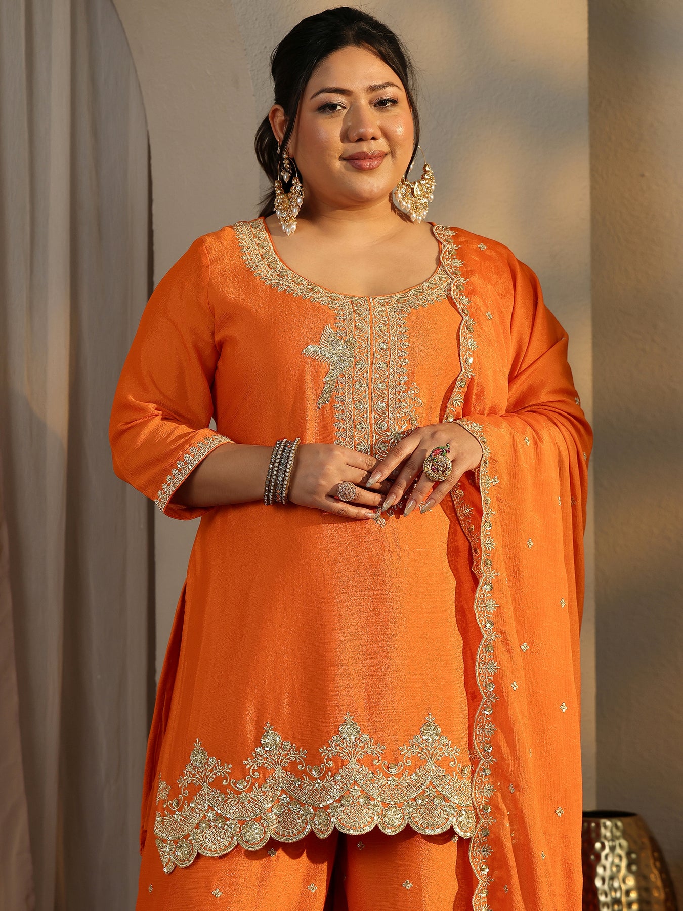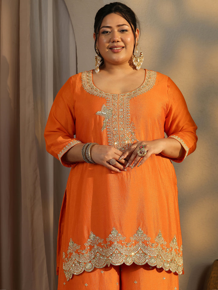 Plus Size Orange Embroidered Chinon Straight Suit Set With Dupatta