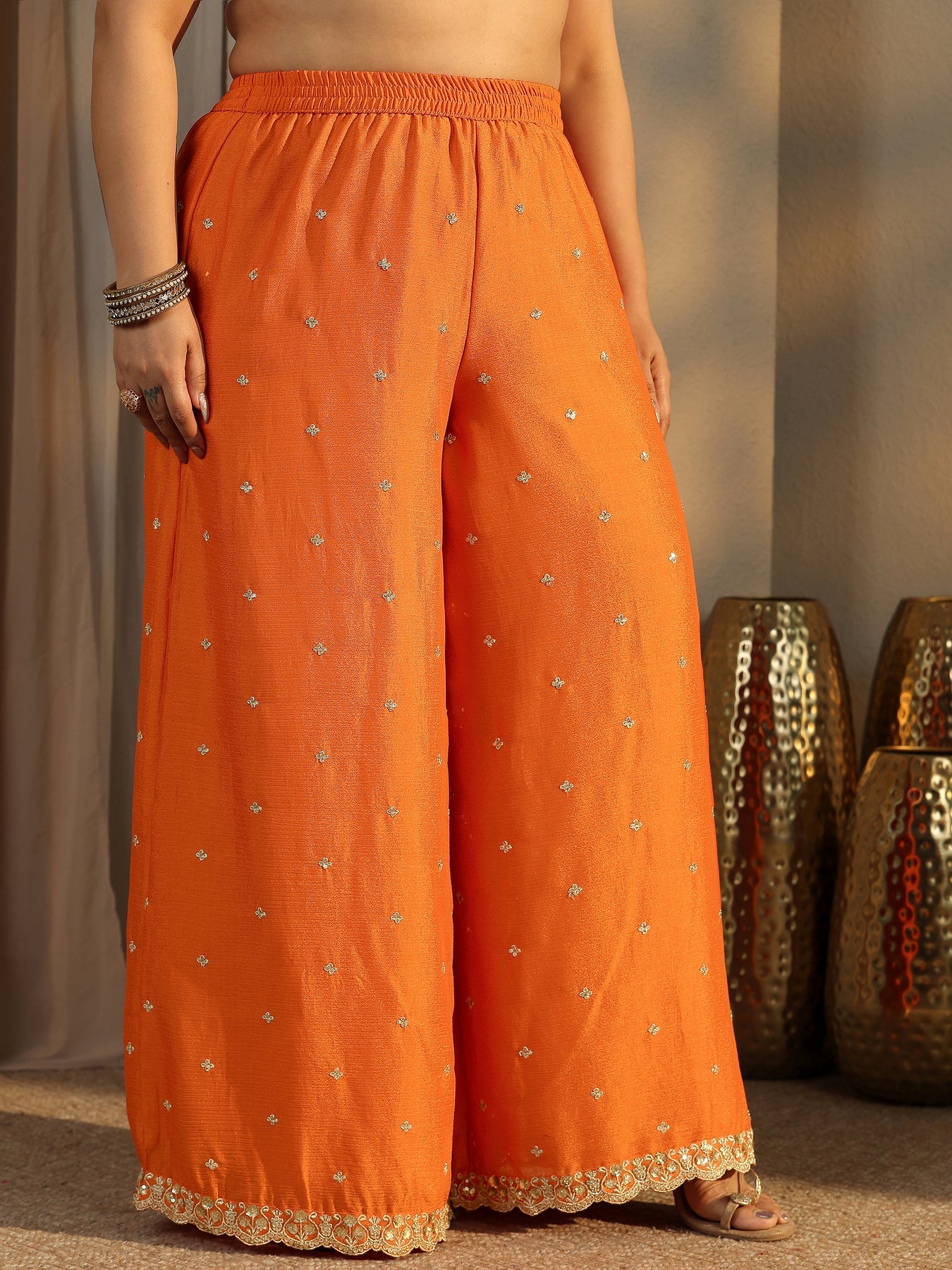 Our 3-piece orange Chinon straight-fit kurta set features a round neckline, regular sleeves, and statement yoke. Complemented with palazzo pants with a partially elasticated waistband and an embroidered dupatta. Adorned with zari embroidered, this style is perfect for dark festive occasions.