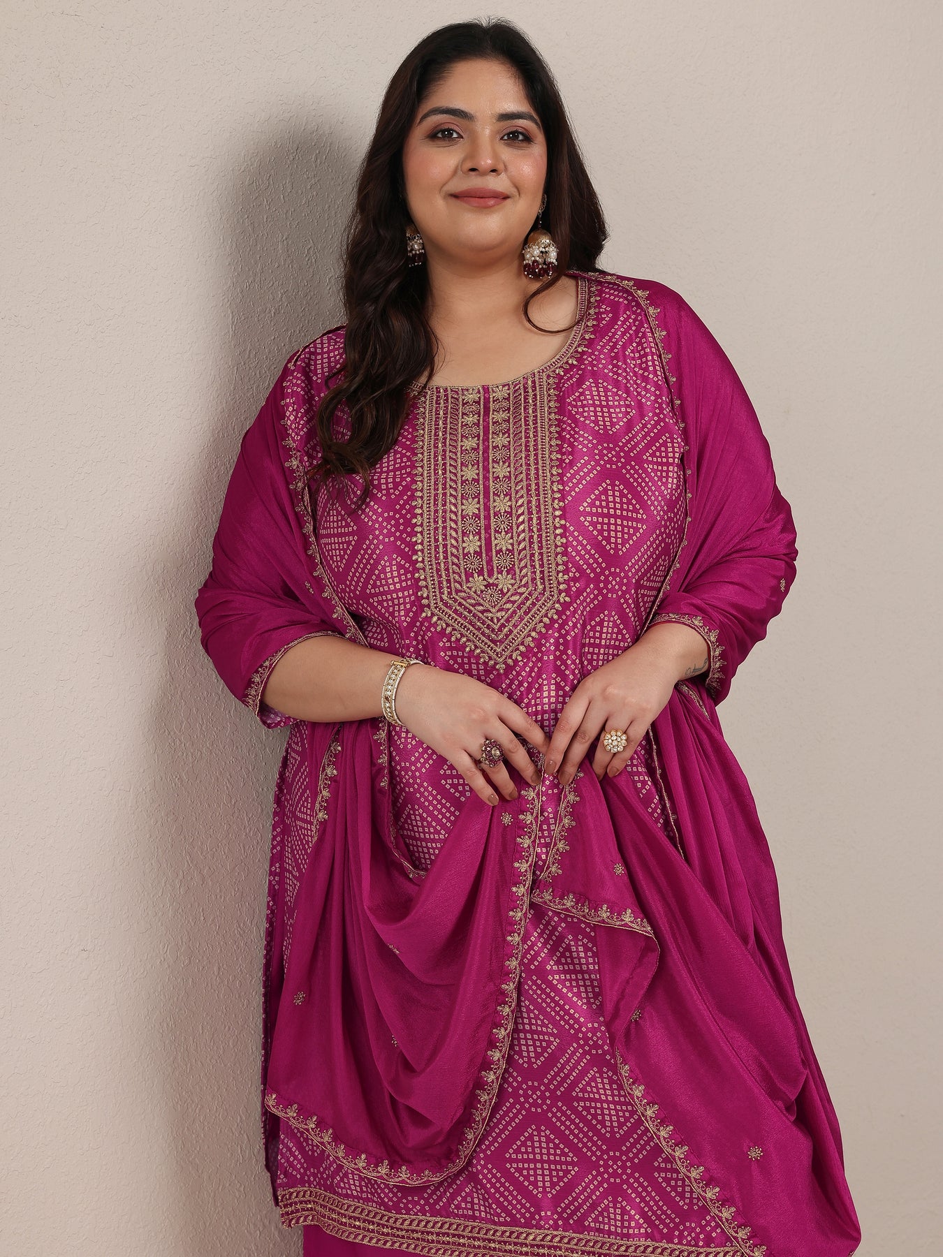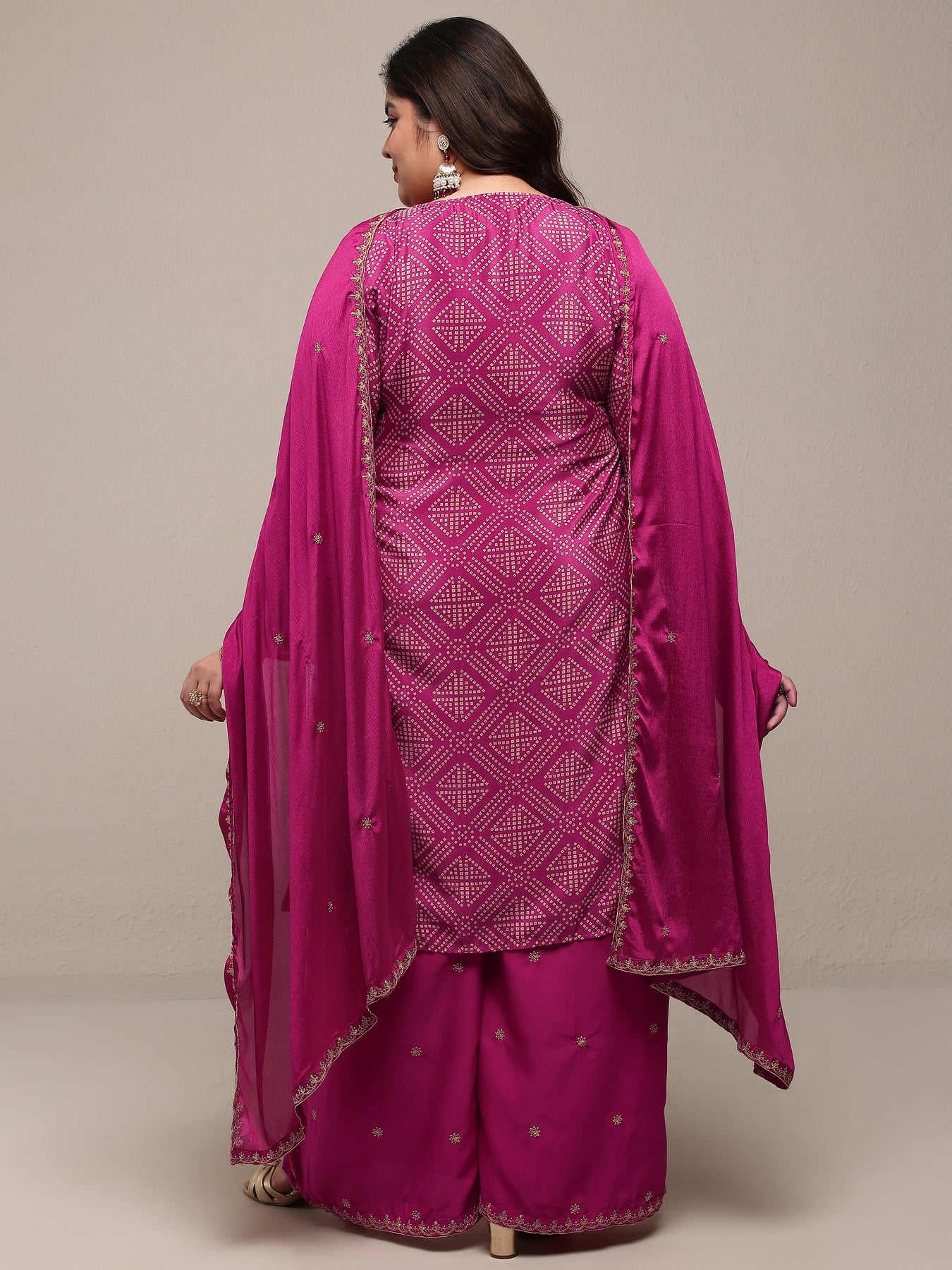 Our 3-piece Pink Chinon Straight-Fit Kurta Set features a Round Neckline, Regular Sleeves, and statement yoke. Complemented with Palazzo Pants with a Partially Elasticated waistband and 2 pockets, and an Embroidered dupatta. Adorned with bandhani printed, this style is perfect for Dark Festive.