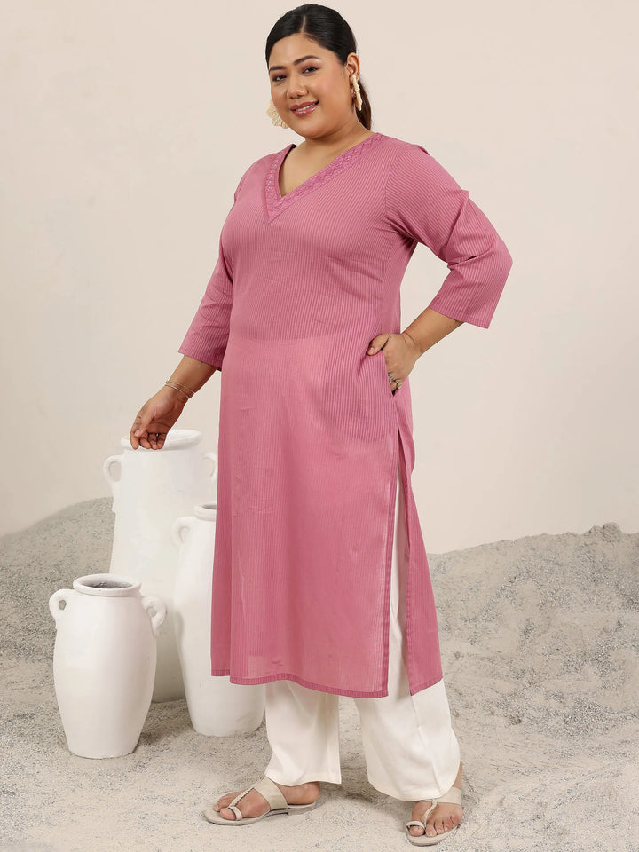 Libas Extra Love collection features our signature designs in comfortable plus sizes. Our pink silk printed straight kurta features a V-neckline and three-quarter sleeves. Highlighted with a striped pattern and thread-work accents, this style is perfect for daytime festivities.