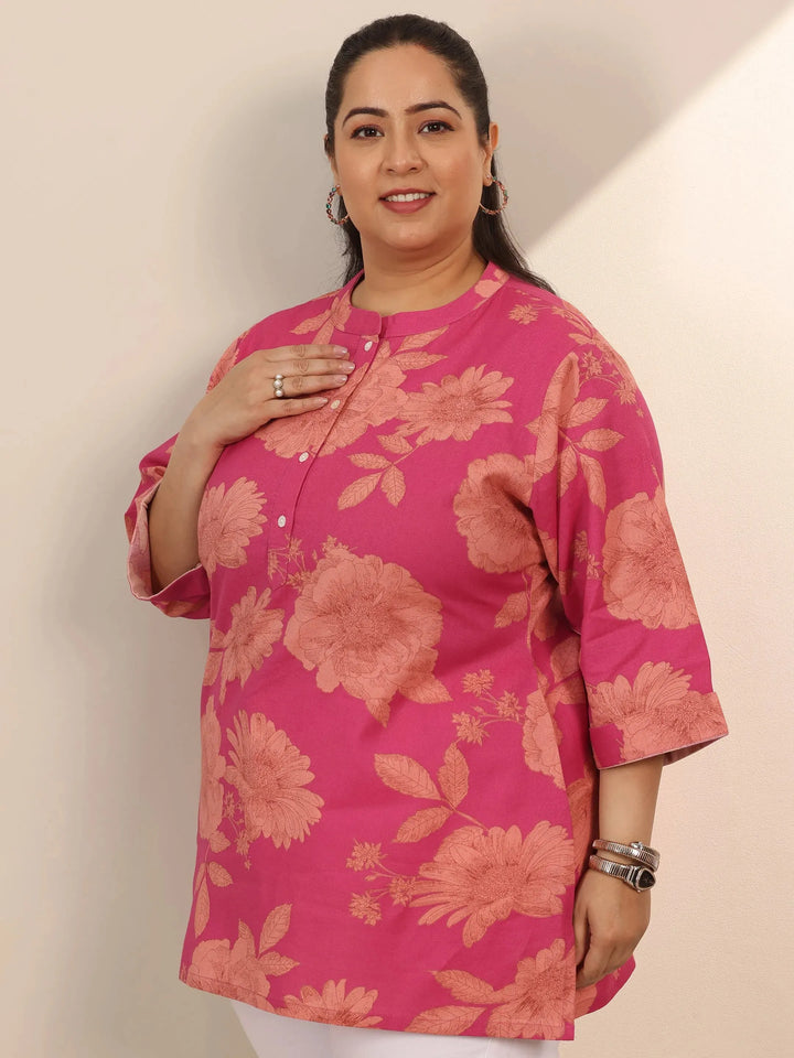 Plus Size Pink Printed Cotton Straight Short Kurti