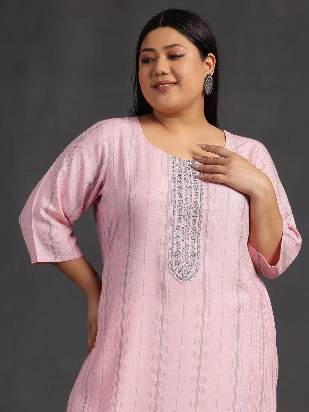 Libas Extra Love collection features our signature designs in comfortable plus sizes. Our pink striped straight-fit kurta, crafted in viscose rayon fabric, features a round neckline, three-quarter sleeves, and a statement yoke. Adorned with intricate thread work and sequins accents, this style is perfect for casual outings.
