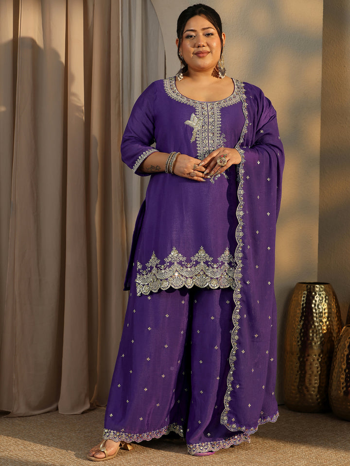 Plus Size Purple Embroidered Chinon Straight Suit Set With Dupatta