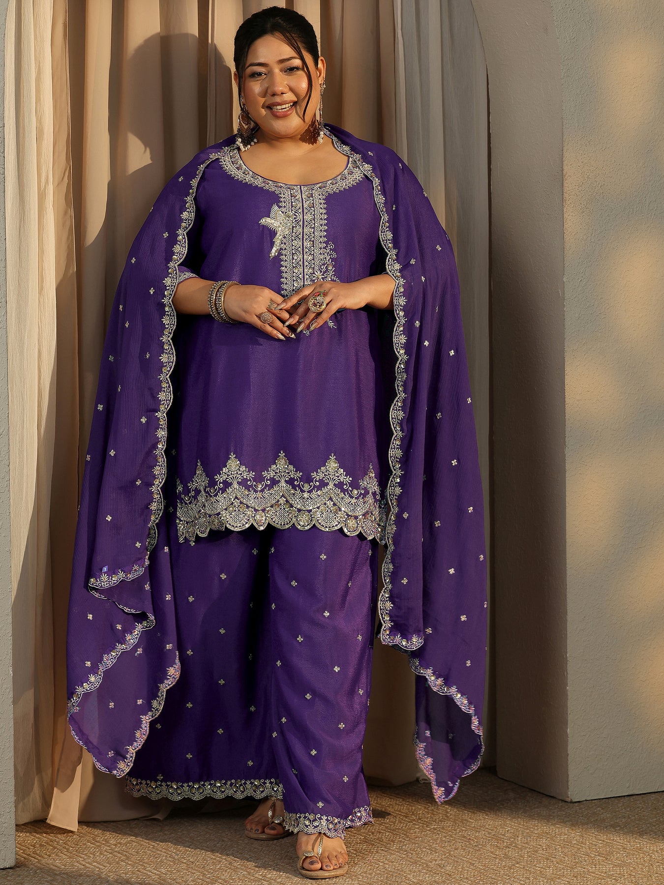 Our 3-piece purple Chinon straight-fit kurta set features a round neckline, regular sleeves, and statement yoke. Complemented with flared palazzo pants with a partially elasticated waistband and an embroidered dupatta. Adorned with zari embroidered, this style is perfect for dark festive occasions.