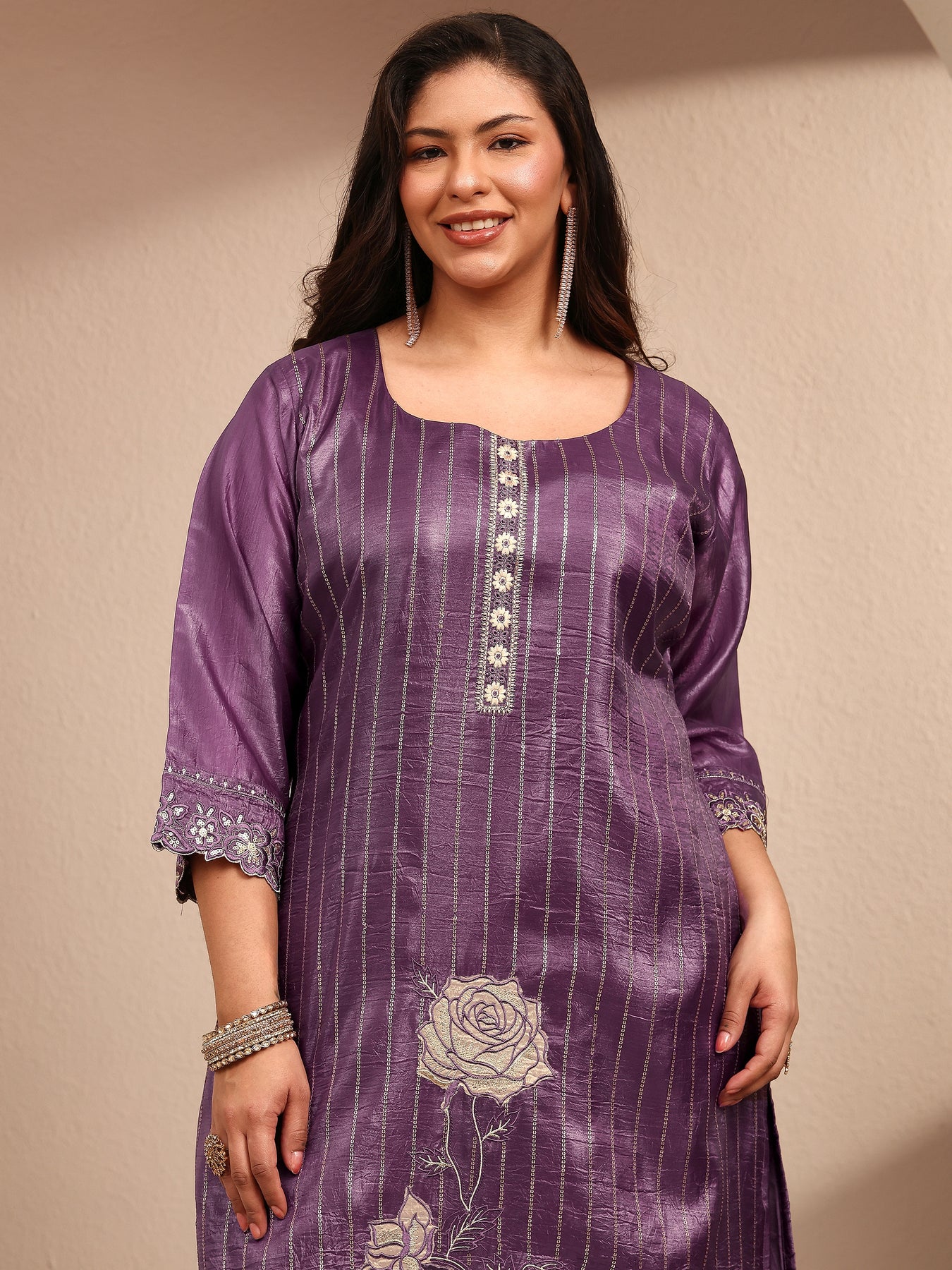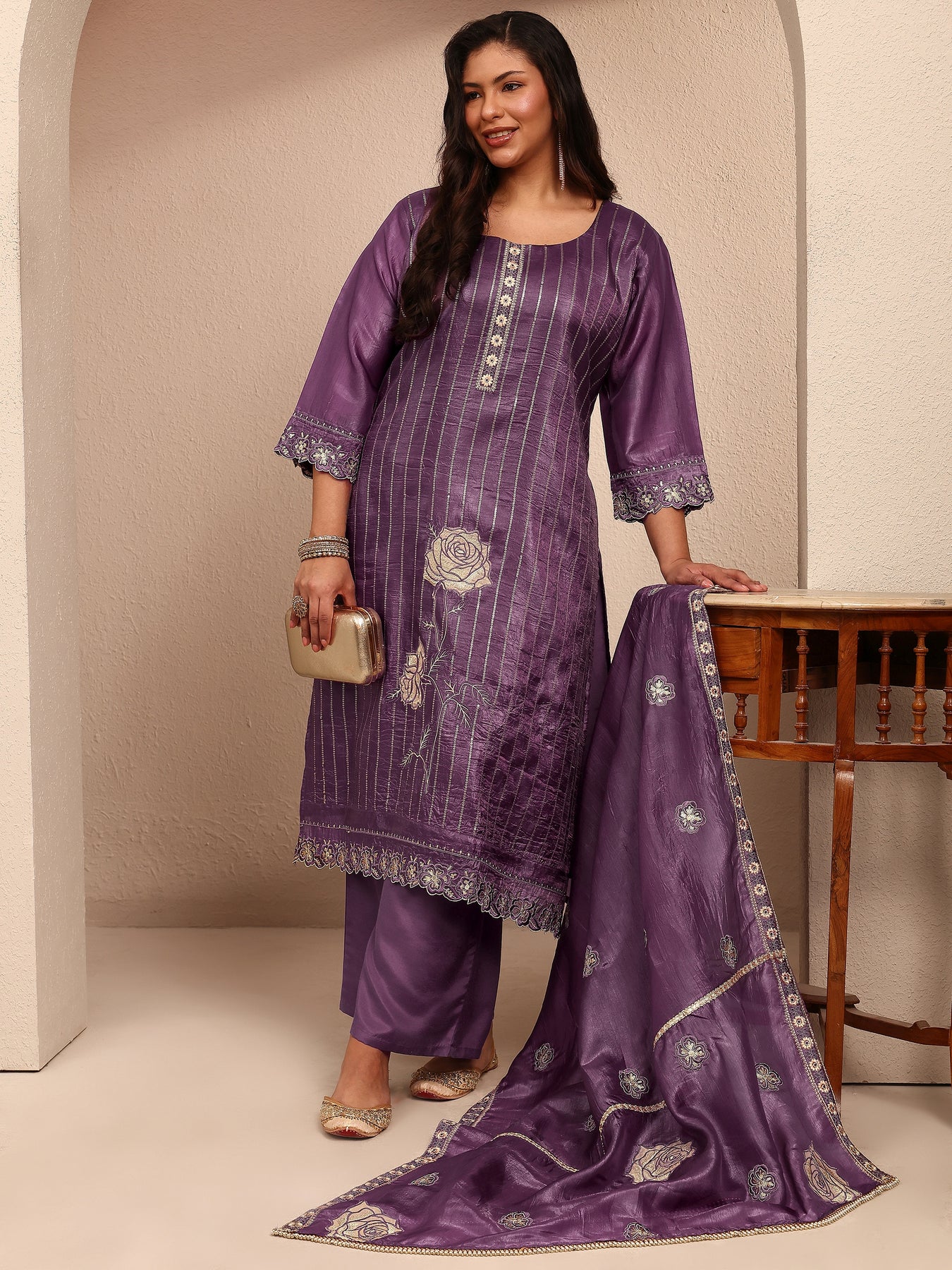 Plus Size Purple Embroidered Organza Straight Suit Set With Dupatta