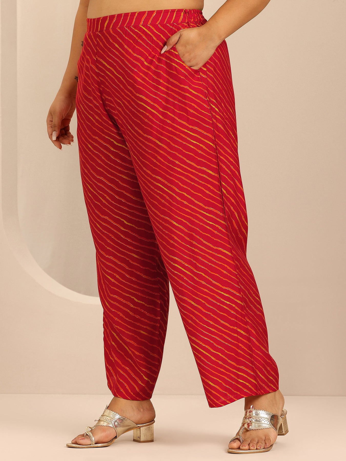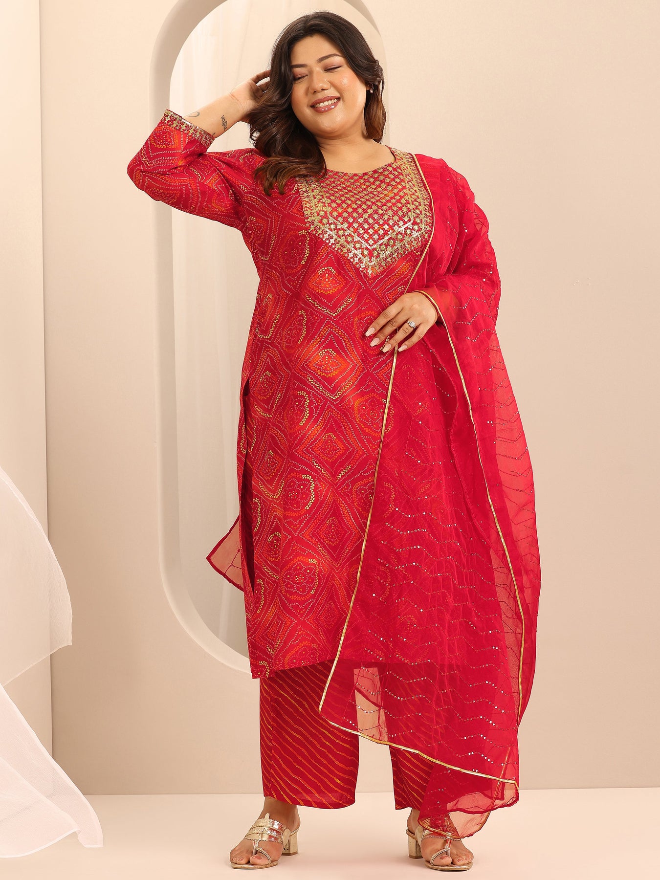 Plus Size Red Printed Silk Blend Straight Suit Set With Dupatta
