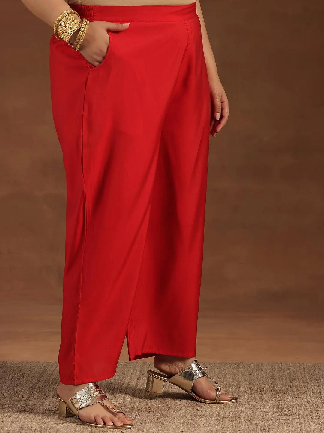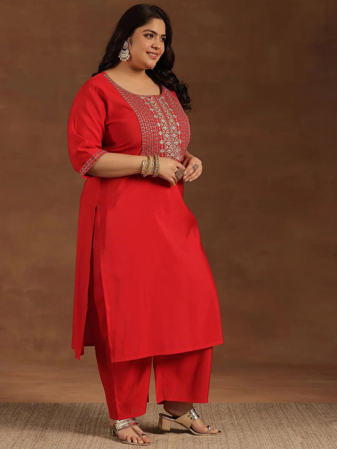 Libas Extra Love collection features our signature designs in comfortable plus sizes. Our 3-piece red yoke-design silk blend suit set features a straight-fit kurta with a round neckline, three-quarter sleeves, and a statement yoke. Complemented with palazzo pants with a partially elasticated waistband and roomy pockets. Adorned with thread work and sequins, this style is perfect for festive celebrations.