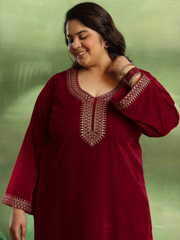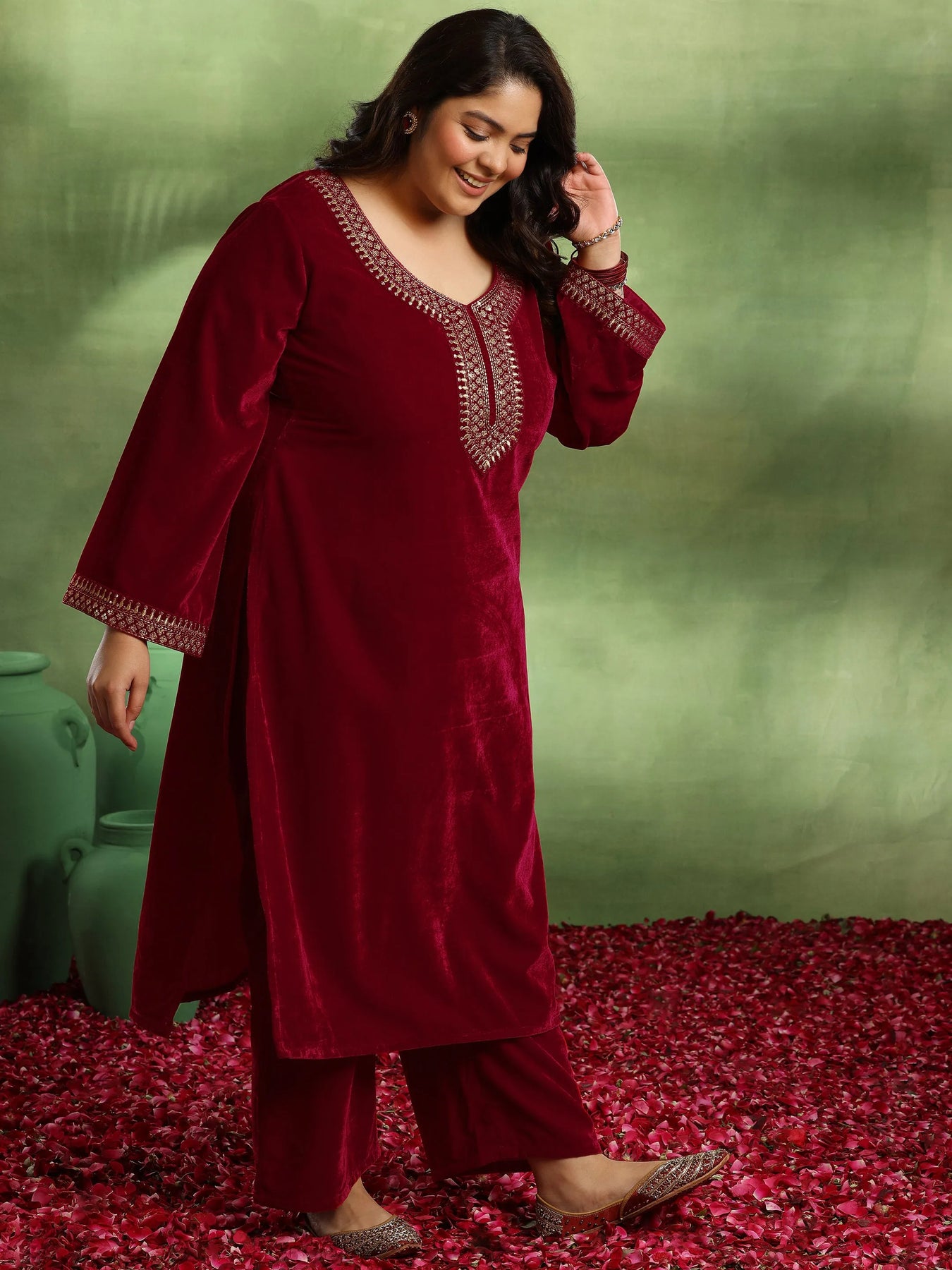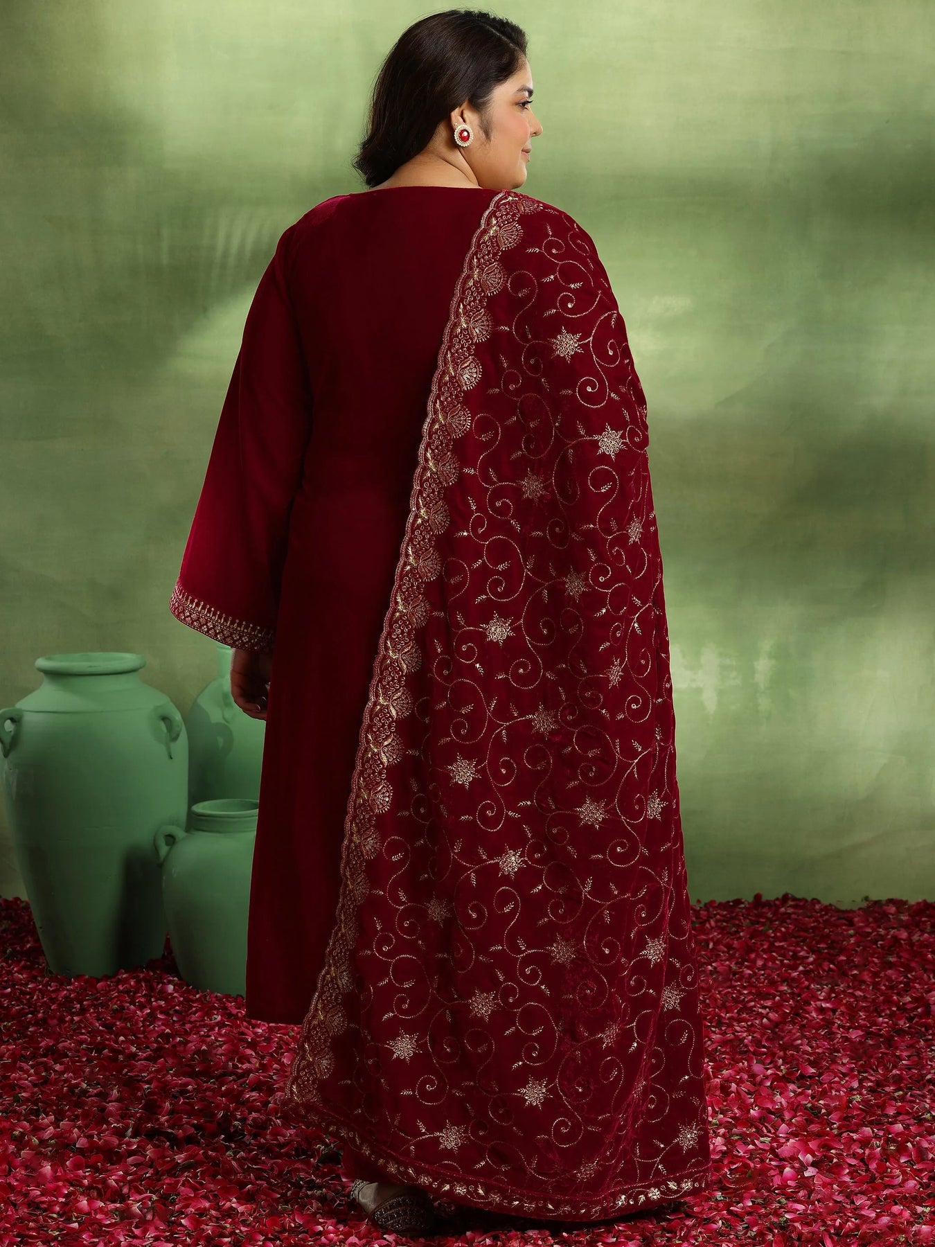 Plus Size Red Yoke Design Velvet Straight Suit With Dupatta