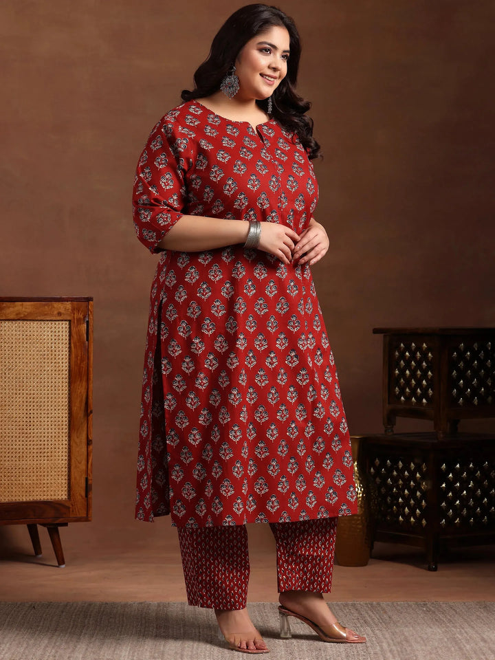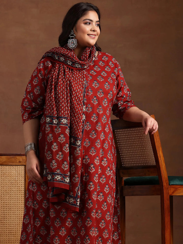 Libas Extra Love collection features our signature designs in comfortable plus sizes. Our 3-piece rust red printed cotton suit set features a straight-fit kurta with a notched neckline and three-quarter sleeves. Complemented with palazzo pants with a partially elasticated waistband and roomy pockets, and a dupatta. Highlighted with floral prints, this style is perfect for elevated everyday style.