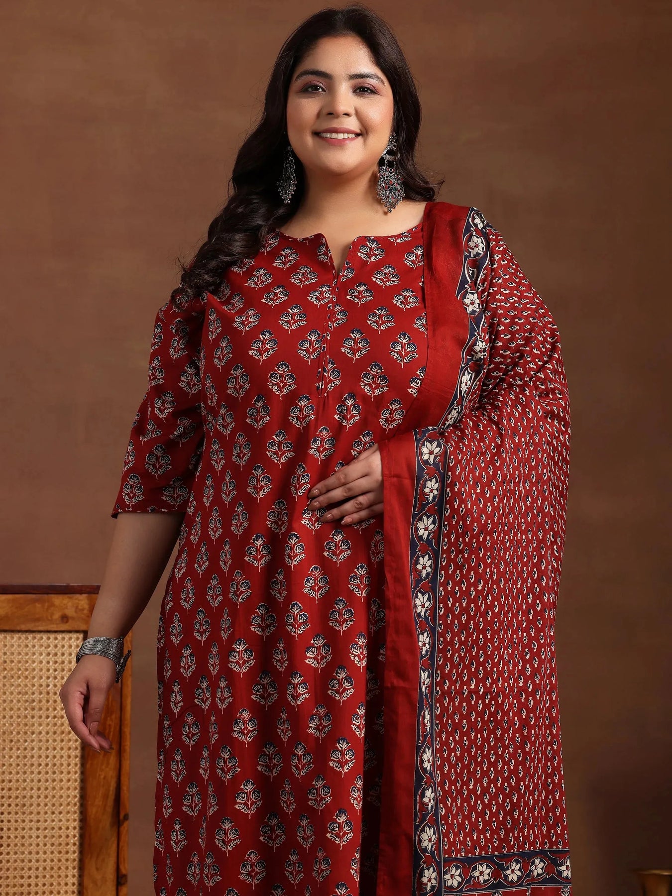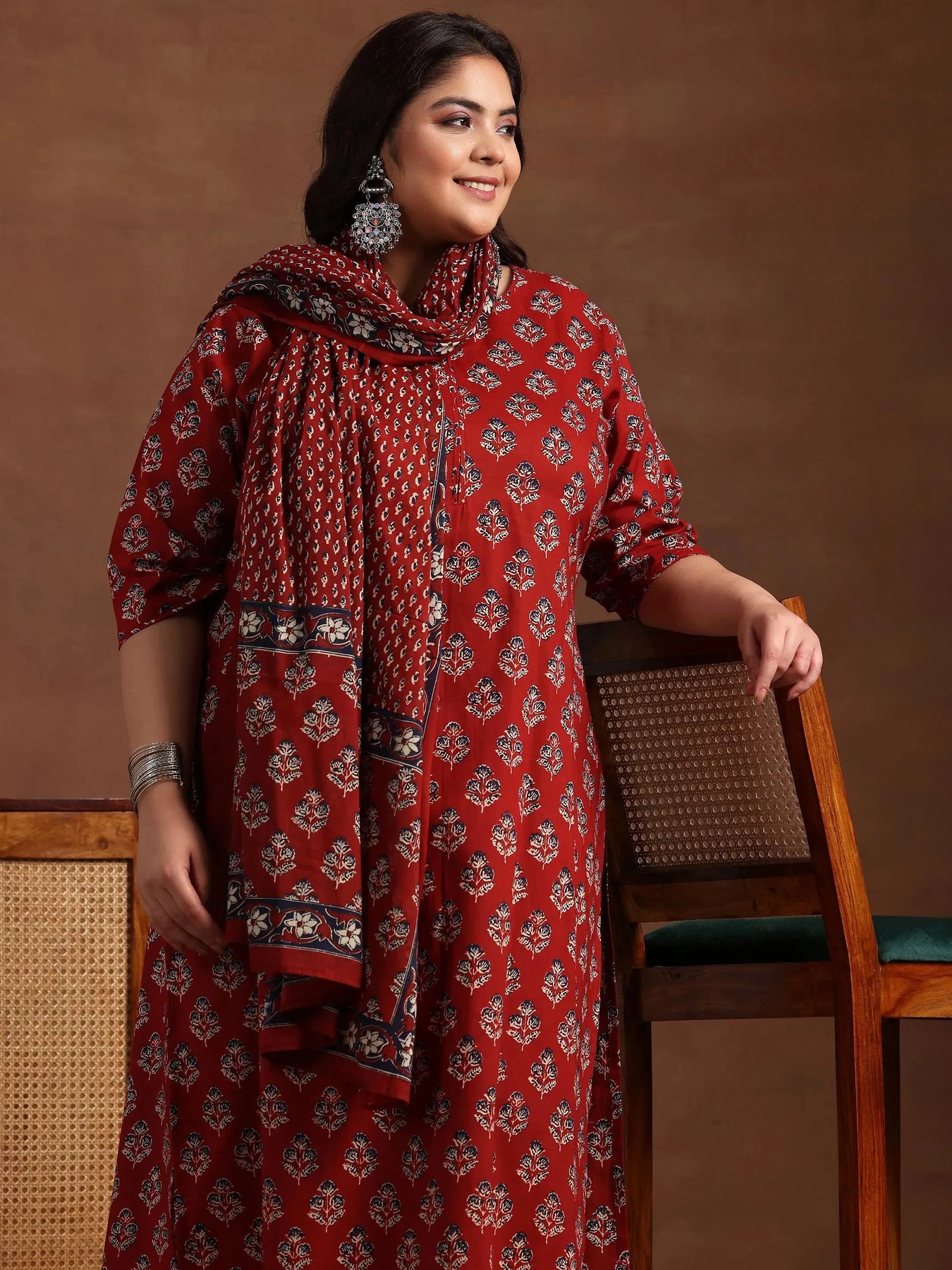 Plus Size Rust Printed Cotton Straight Suit With Dupatta