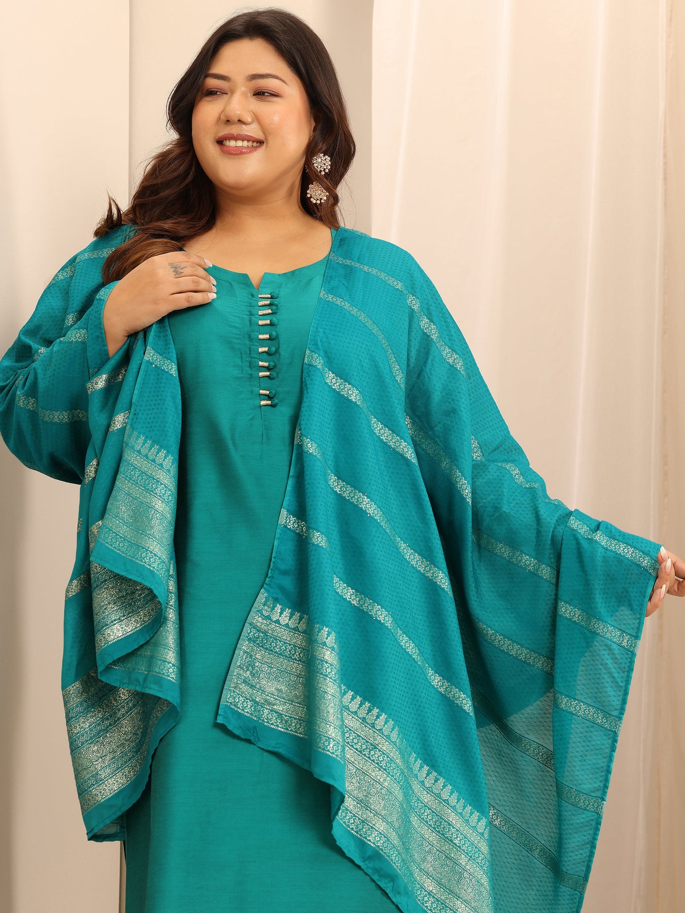 Plus Size Teal Solid Silk Blend Straight Suit Set With Dupatta