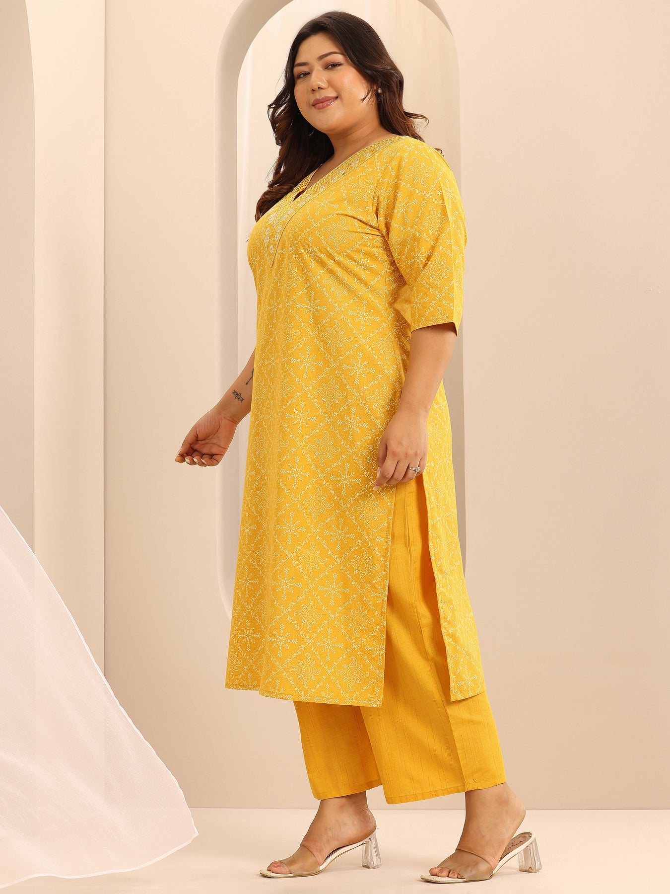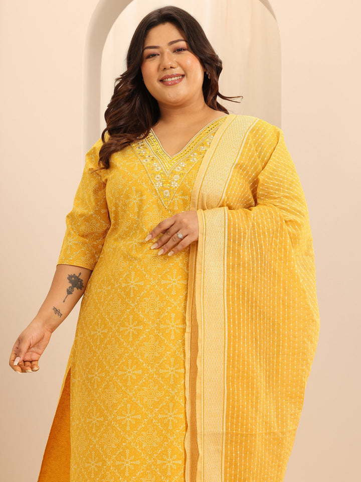 Plus Size Yellow Printed Cotton Blend Straight Suit Set With Dupatta