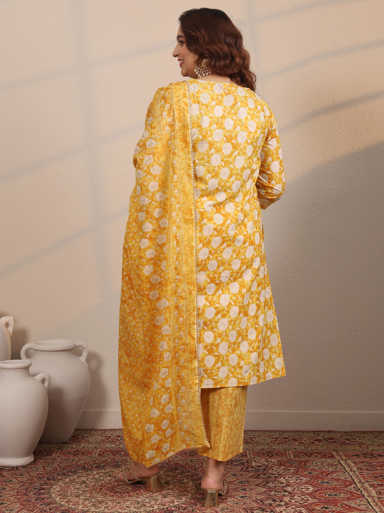 Plus Size Yellow Printed Cotton Straight Suit Set With Dupatta