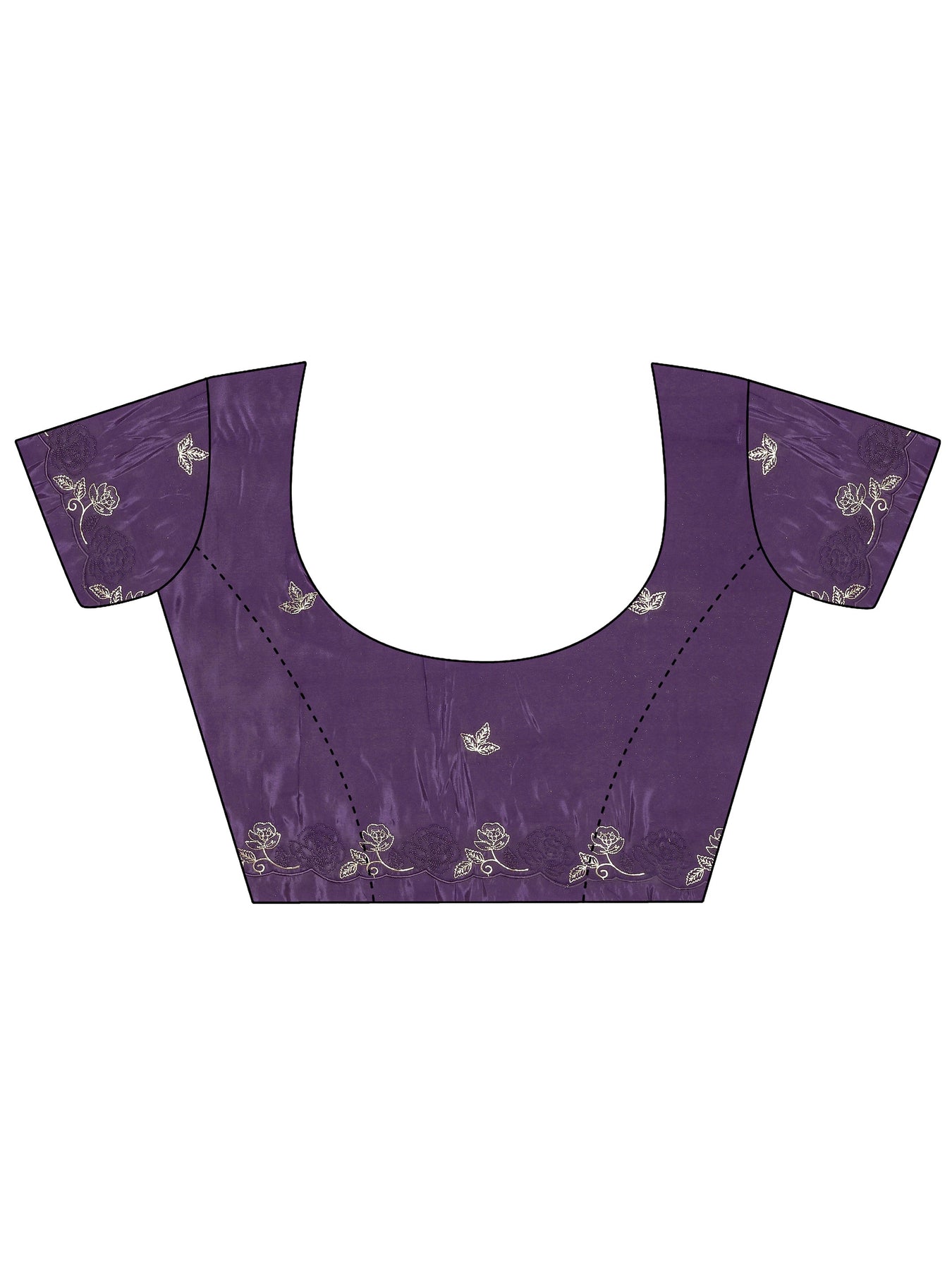 Our purple silk-blend saree features a radiant, high-sheen finish adorned with exquisite gold and silver floral embroidery along the border and scattered across the body. Complemented with unstitched blouse, this graceful saree is perfect for festive occasions and traditional celebrations.