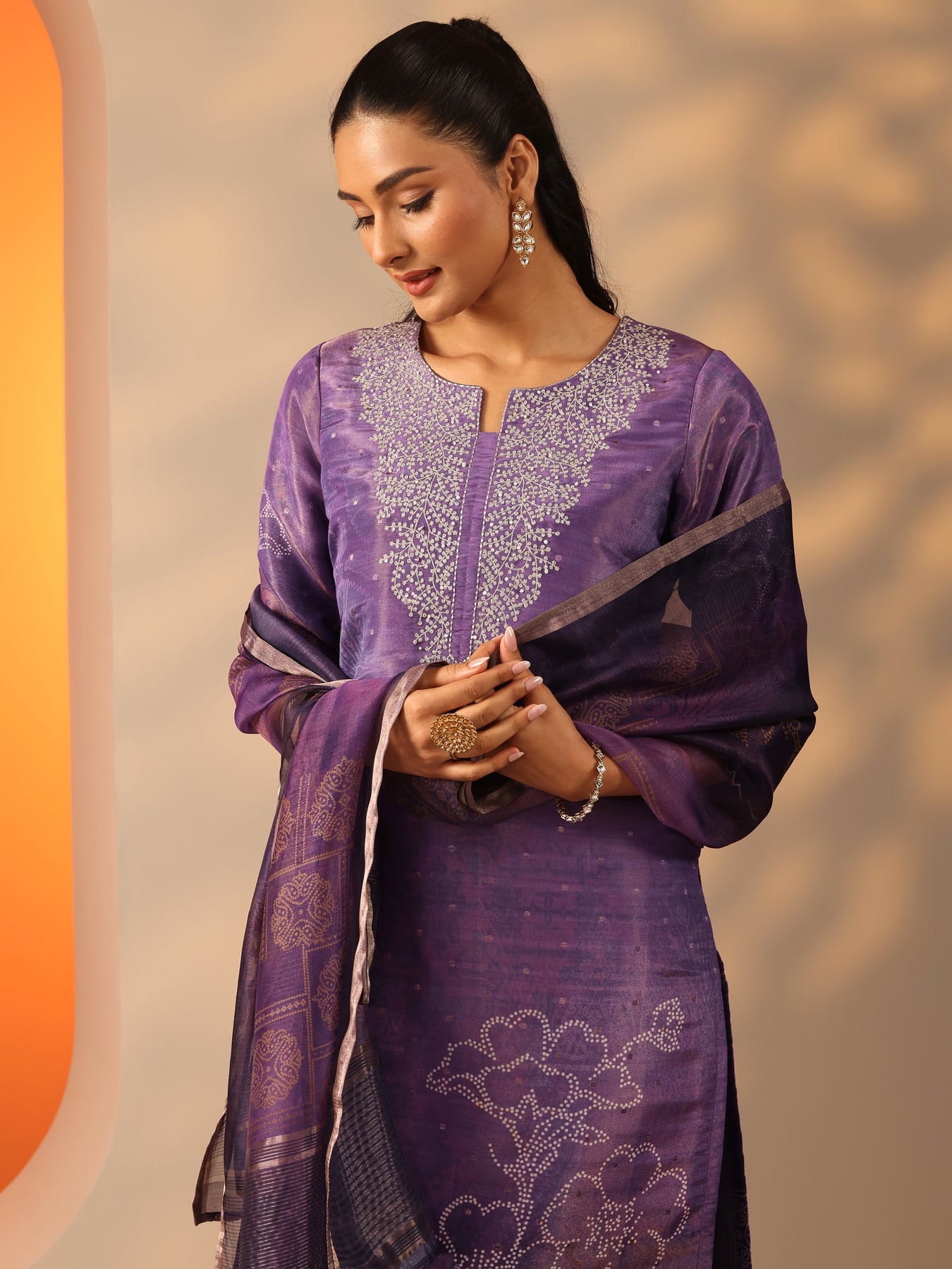 Our 3-piece purple silk blend straight-fit kurta set features a notched neckline, regular sleeves, and a statement yoke. Complemented with lining and straight pants with a partially elasticated waistband and 2 pockets, and a printed dupatta. Adorned with embroidered and zari embellished accents, this style is perfect for dark festive occasions.