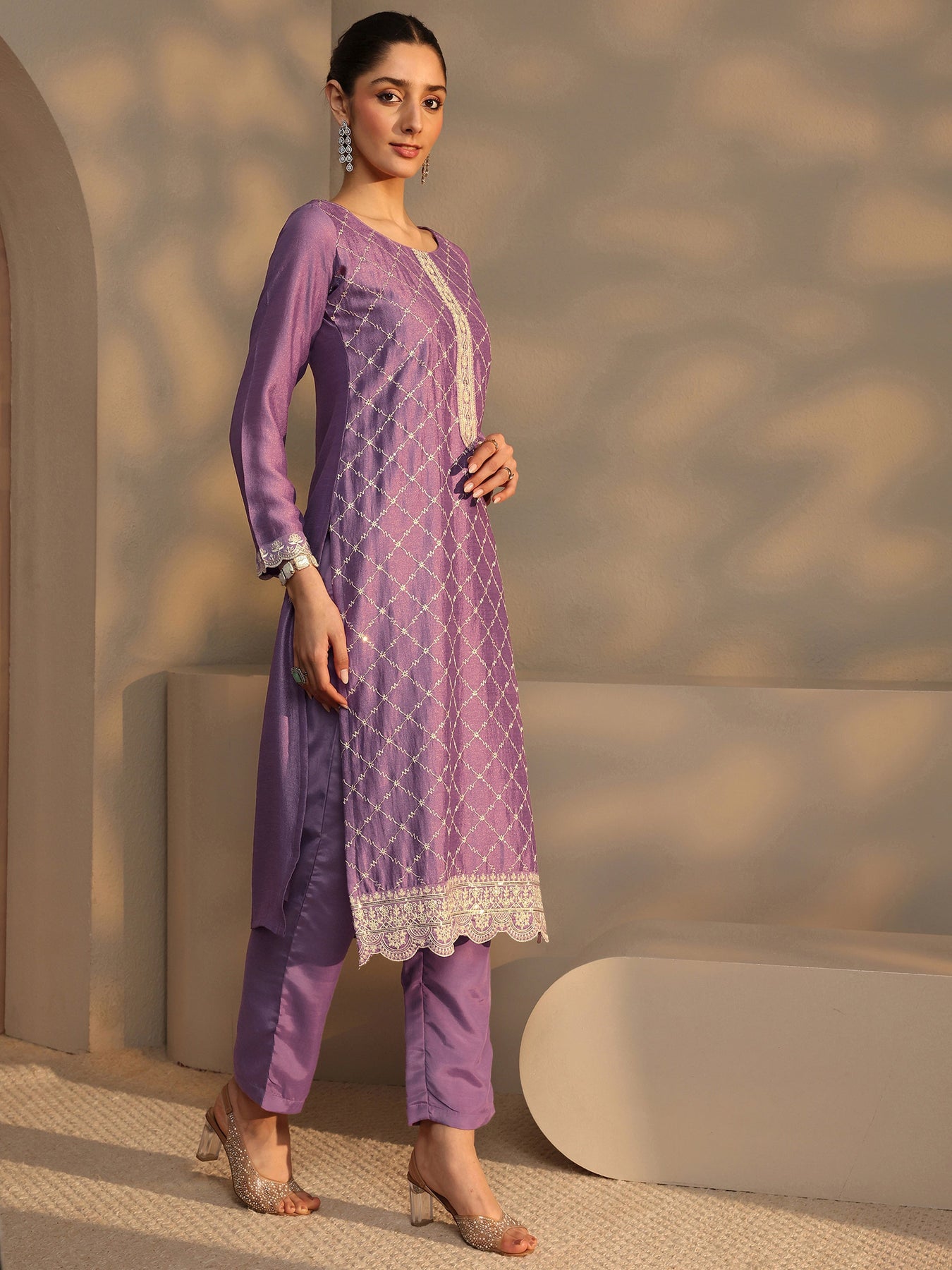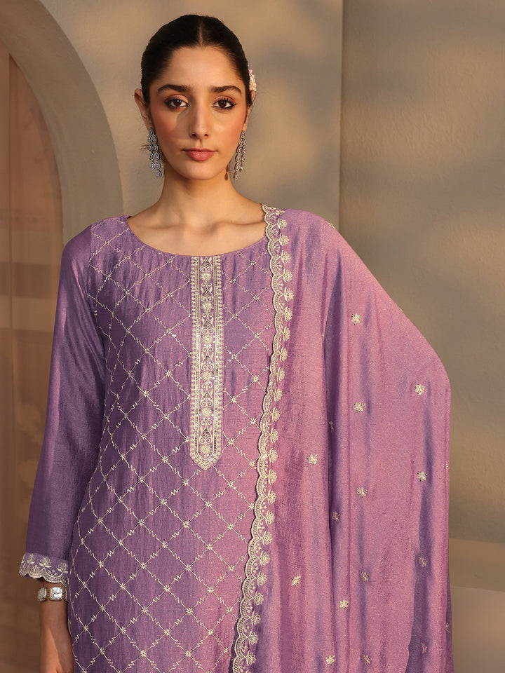 Purple Embroidered Silk Blend Straight Suit Set With Dupatta