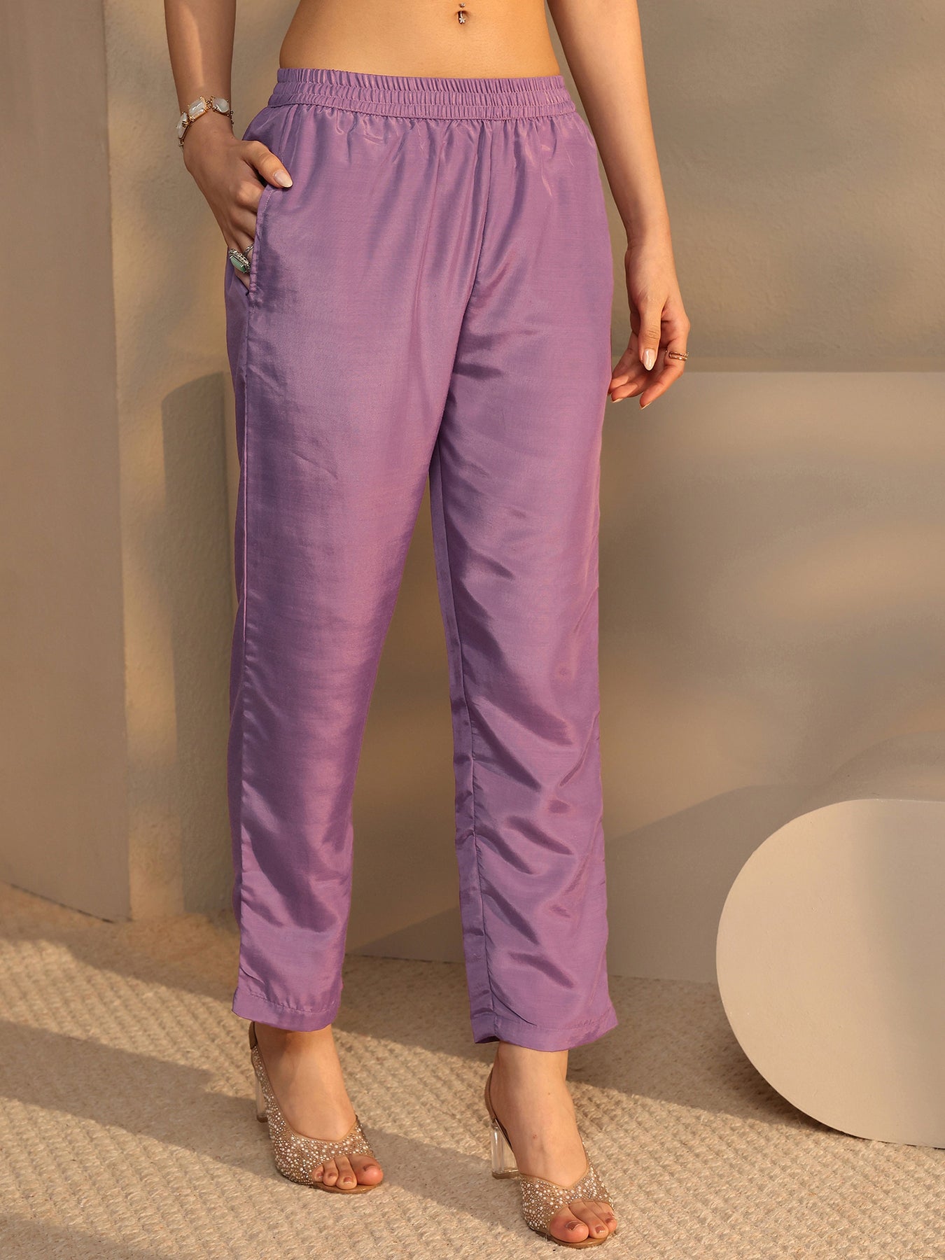 Our 3-piece purple silk blend straight-fit kurta set features a round neck neckline, regular sleeves, and statement yoke. Complemented with lining and straight pants with a partially elasticated waistband and 2 pockets, and an embroidered dupatta. Adorned with ethnic motif thread embroidered, this style is perfect for festive occasions.