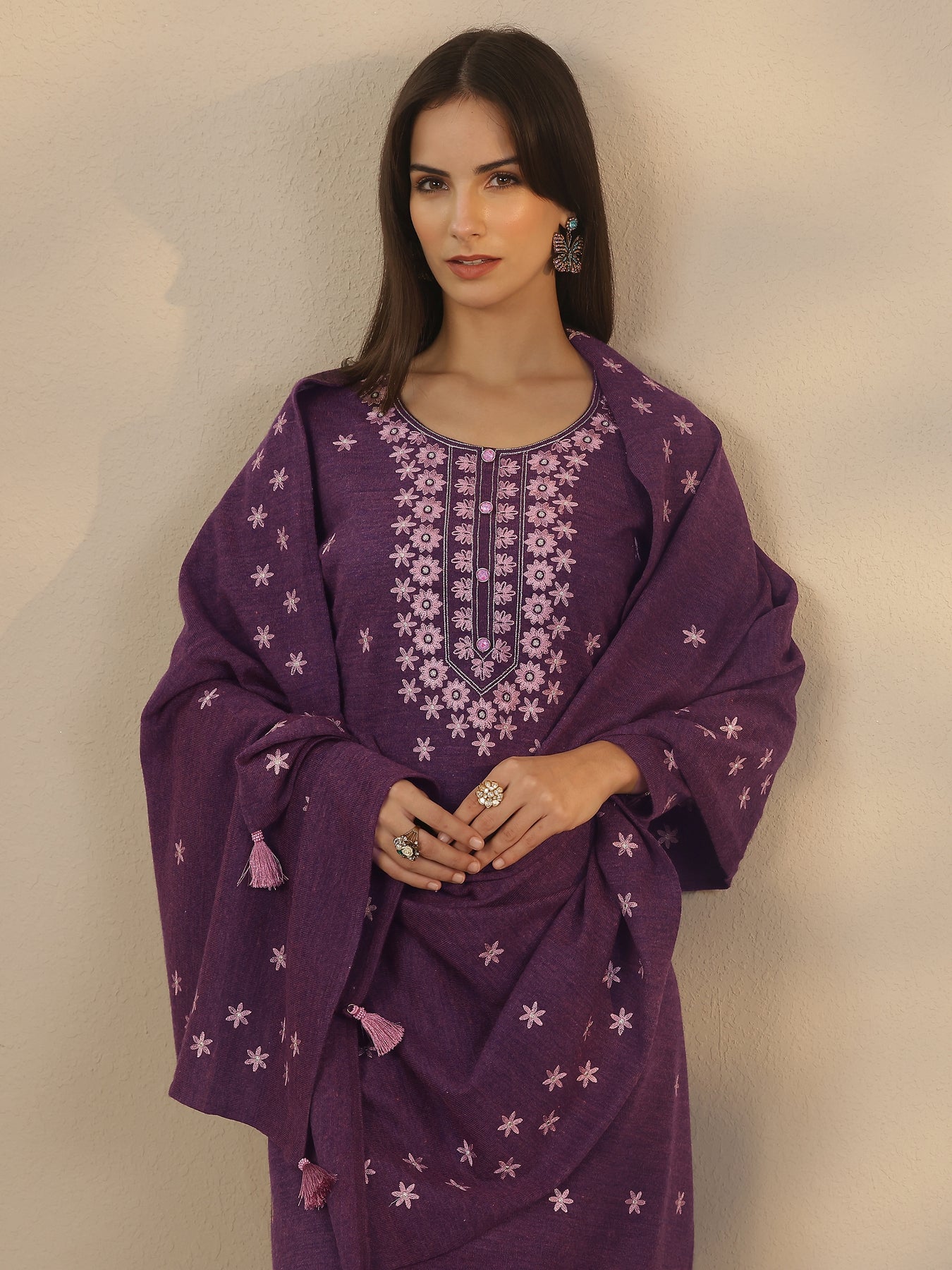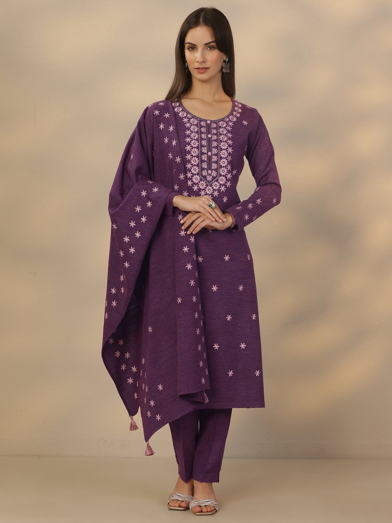 Purple Embroidered Wool Straight Suit Set With Dupatta