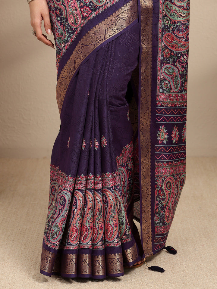 Purple Paisley Printed Silk Blend Saree With Unstitched Blouse Piece