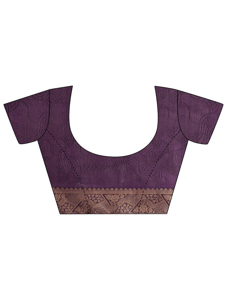 Our purple silk blend saree features a captivating paisley design inspired by the rich craft of Banarasi weaves. Complemented with a blouse piece. This charming saree is perfect for festive occasions.