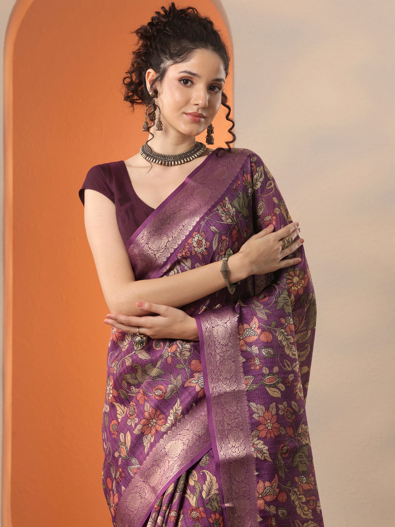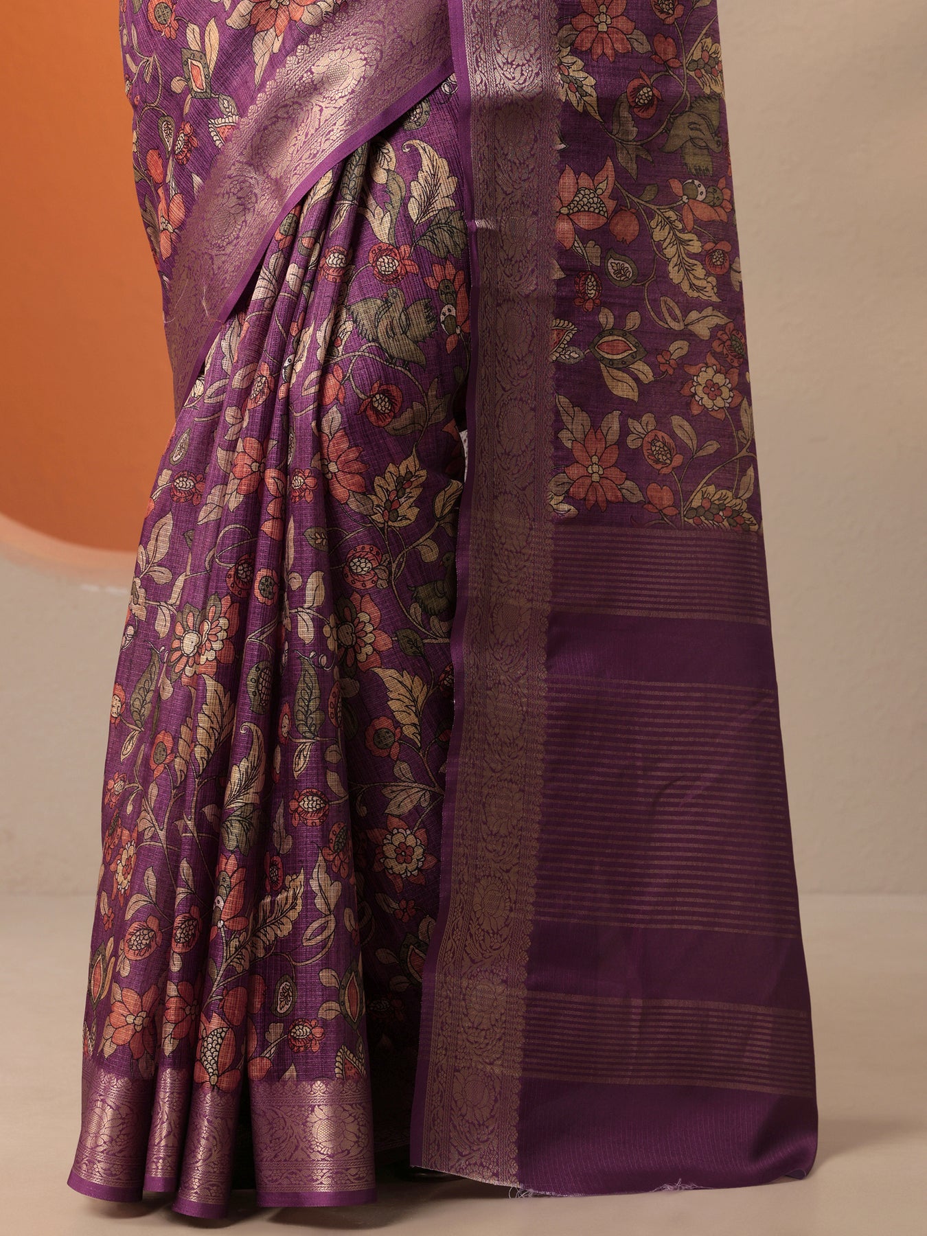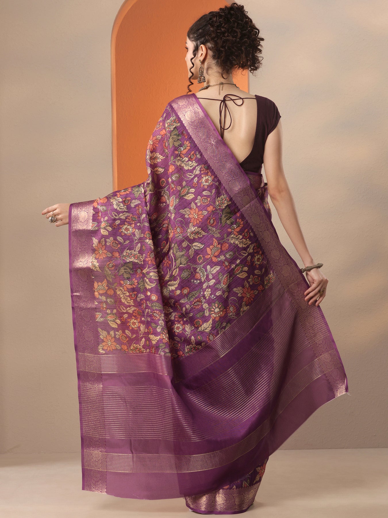 Purple Printed Kota Saree With Unstitched Blouse Piece