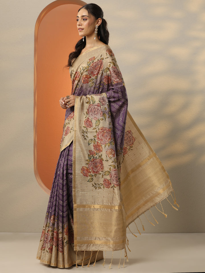 Purple Printed Silk Blend Saree With Unstitched Blouse Piece