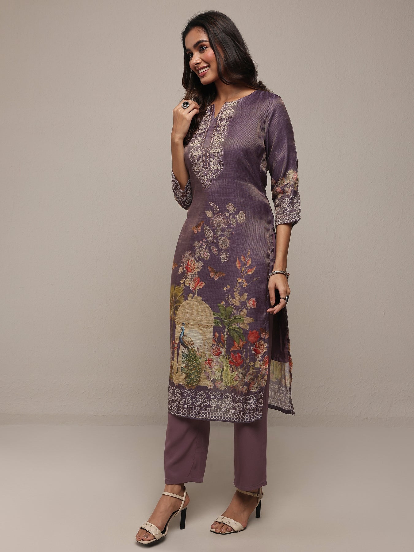 Purple Printed Silk Blend Straight Suit Set With Dupatta