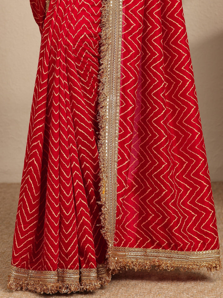 Red Chevron Printed Silk Blend Saree With Unstitched Blouse Piece