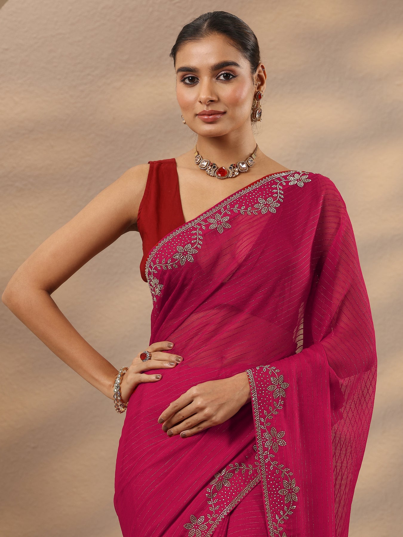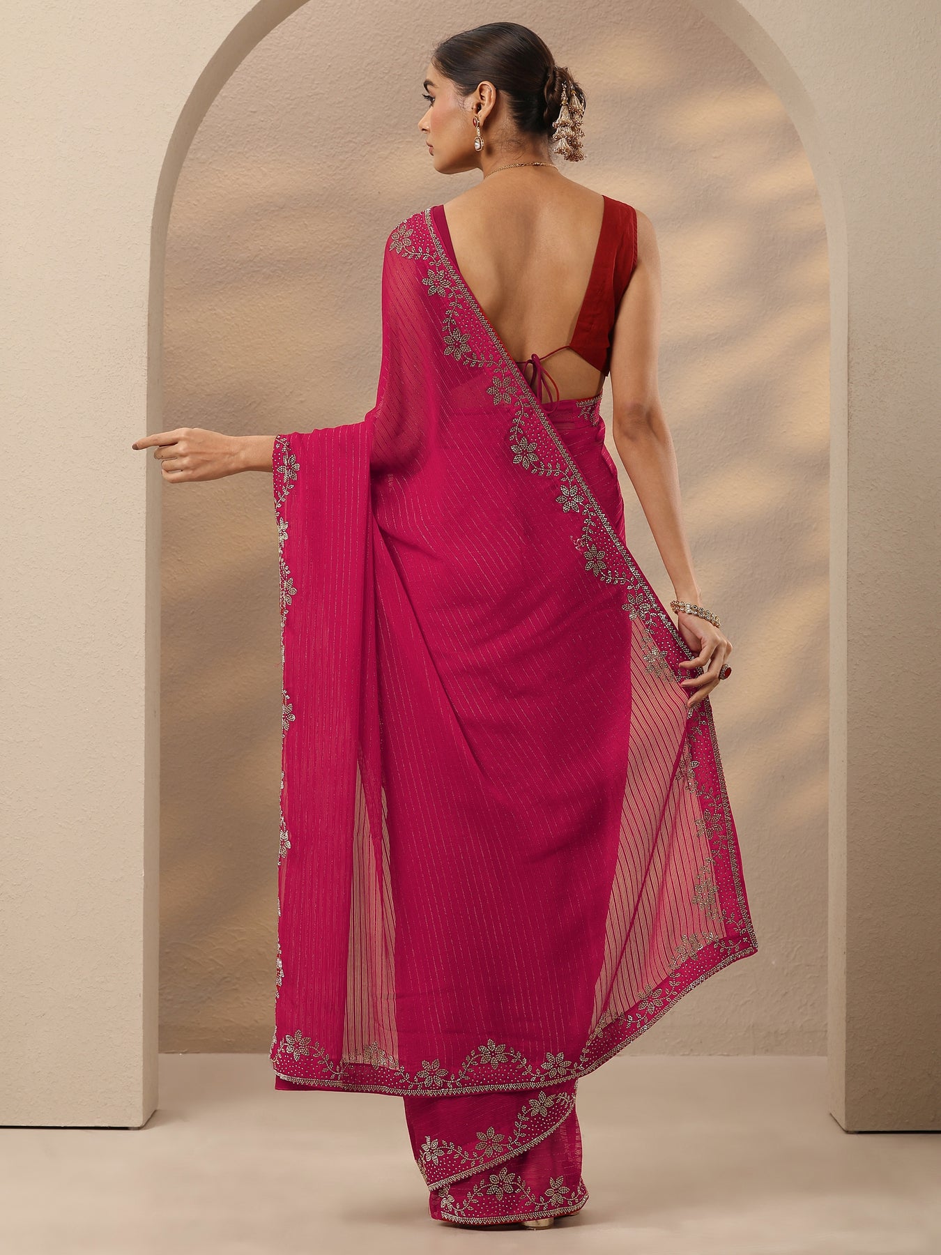 Our Red Embroidered Georgette Saree Features Captivating Embellished. Complemented With An Unstitched Blouse Piece. This Charming Saree Is Perfect For Festive Occasions.