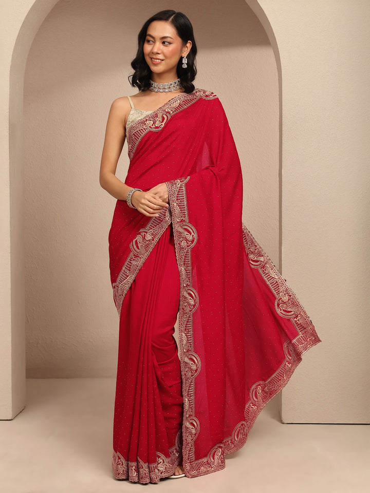 Red Embellished Silk Blend Saree With Unstitched Blouse Piece