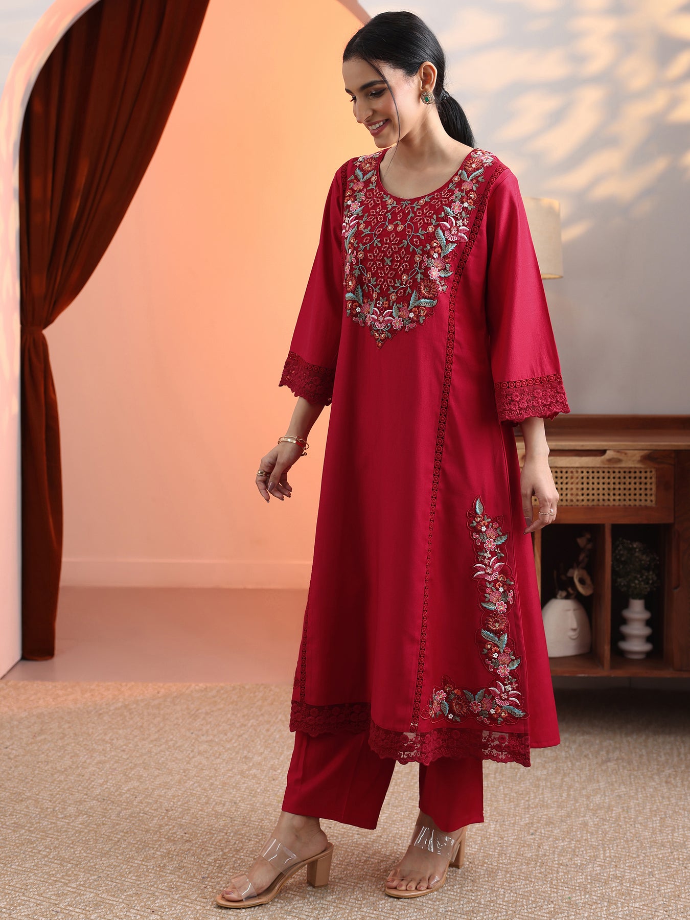 Our 3-piece Red Silk blend Straight-fit Kurta Set features a Round Neckline, Regular Sleeves, and statement yoke. Complemented with Straight Pants with a Partially Elasticated waistband, and a Printed dupatta. Adorned with Floral Embroidered accents, this style is perfect for Festive wear.
