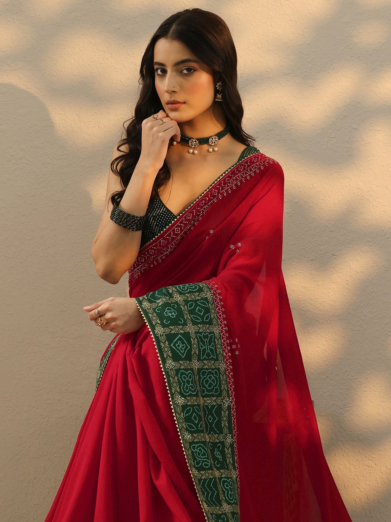 Our Red Printed Chinon Saree Features Captivating Bandhani Print. Complemented With An Unstitched Blouse Piece. This Charming Saree Is Perfect For Festive Occasions