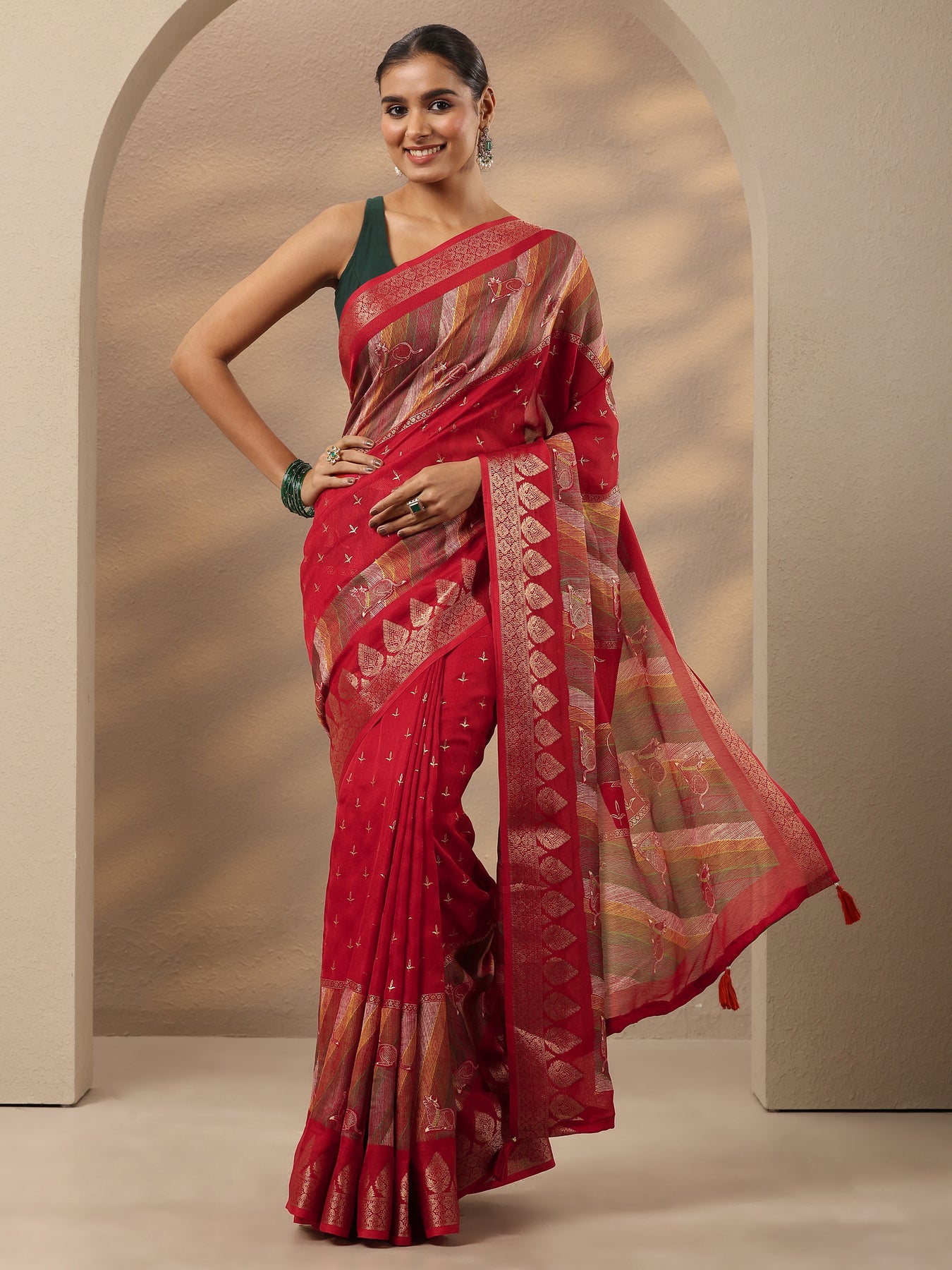 Our Red Printed Silk Blend Saree Features Captivating Ethnic Motif. Complemented With An Unstitched Blouse Piece. This Charming Saree Is Perfect For Festive Occasions.