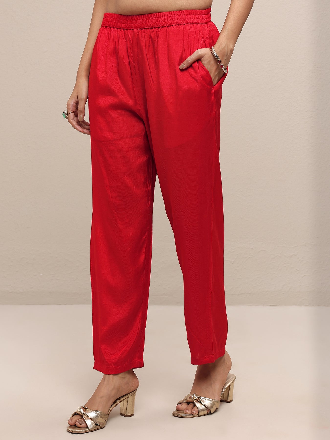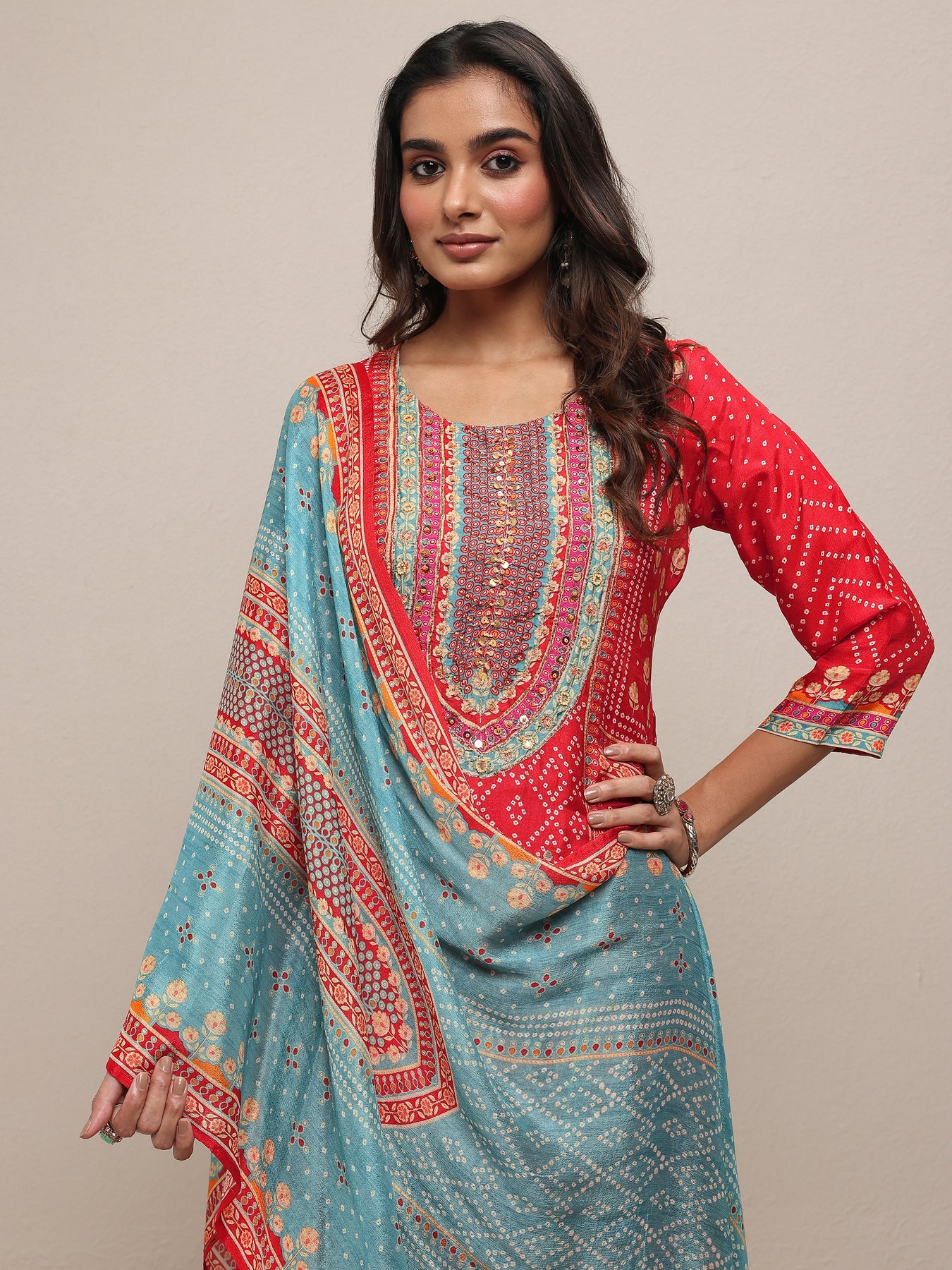 Our 3-piece Red Silk blend Kurta Set features a Straight-fit kurta with a Round Neckline, Regular Sleeves, and statement yoke. Complemented with Straight Pants with a Partially Elasticated waistband and 2 pockets, and a Printed dupatta. Adorned with bandhani printed, this style is perfect for Festive occasions.