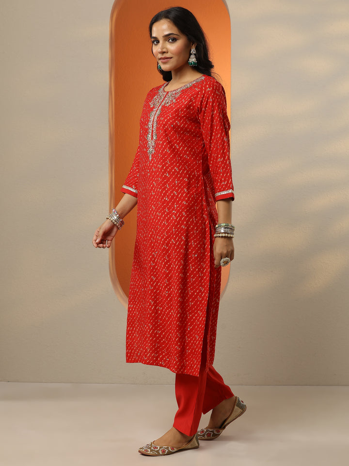 Our 3-piece Red Silk blend Straight-fit Kurta Set features a Round Neckline, Regular Sleeves, and statement yoke. Complemented with Straight Pants with a Partially Elasticated waistband and 2 pockets, and an Embroidered dupatta. Adorned with Leheriya Printed, this style is perfect for Dark Festive.