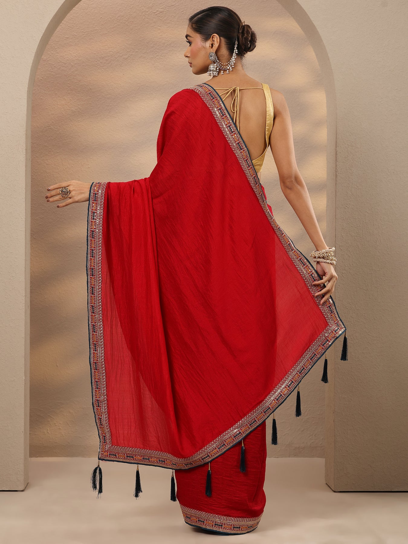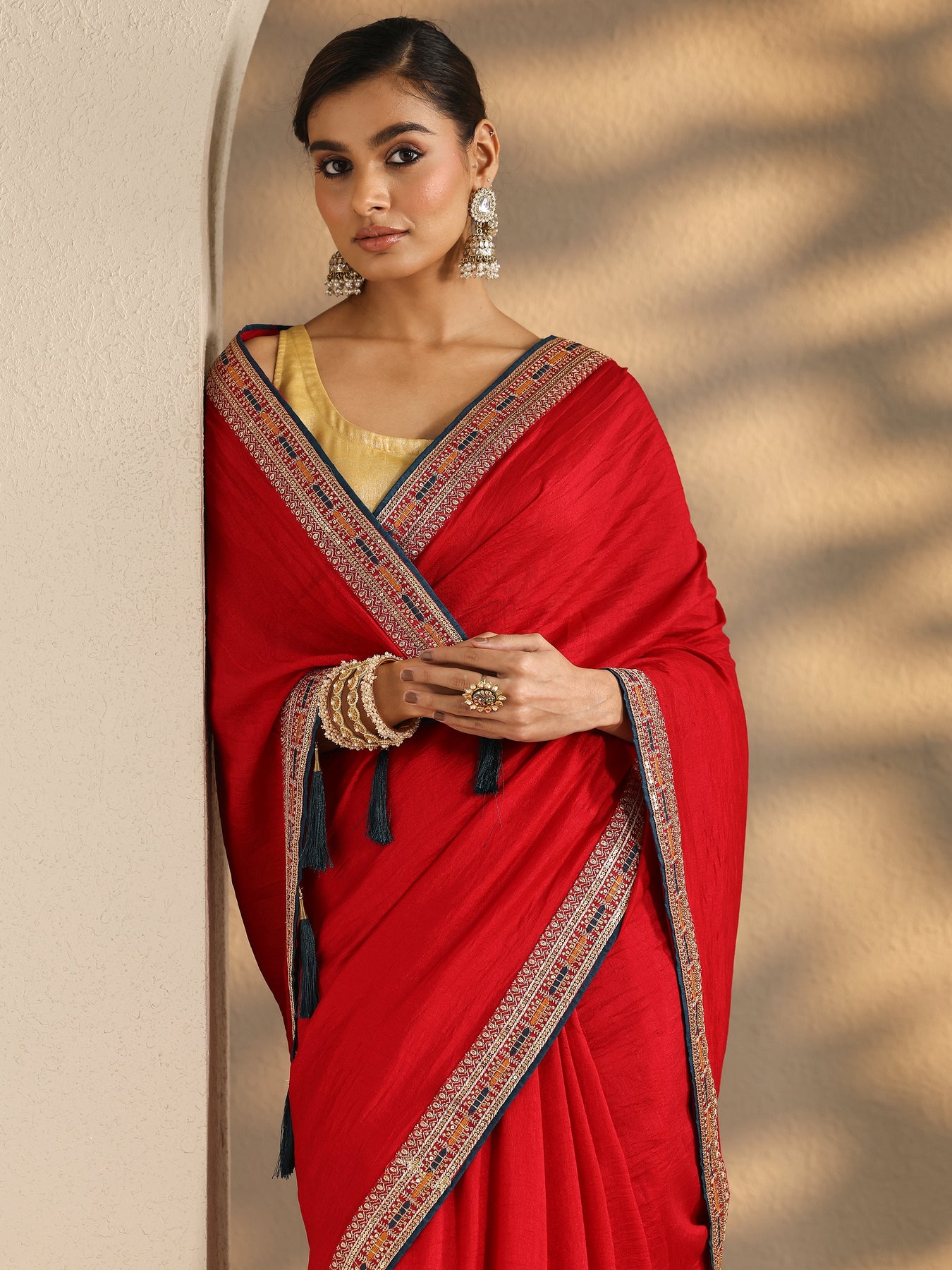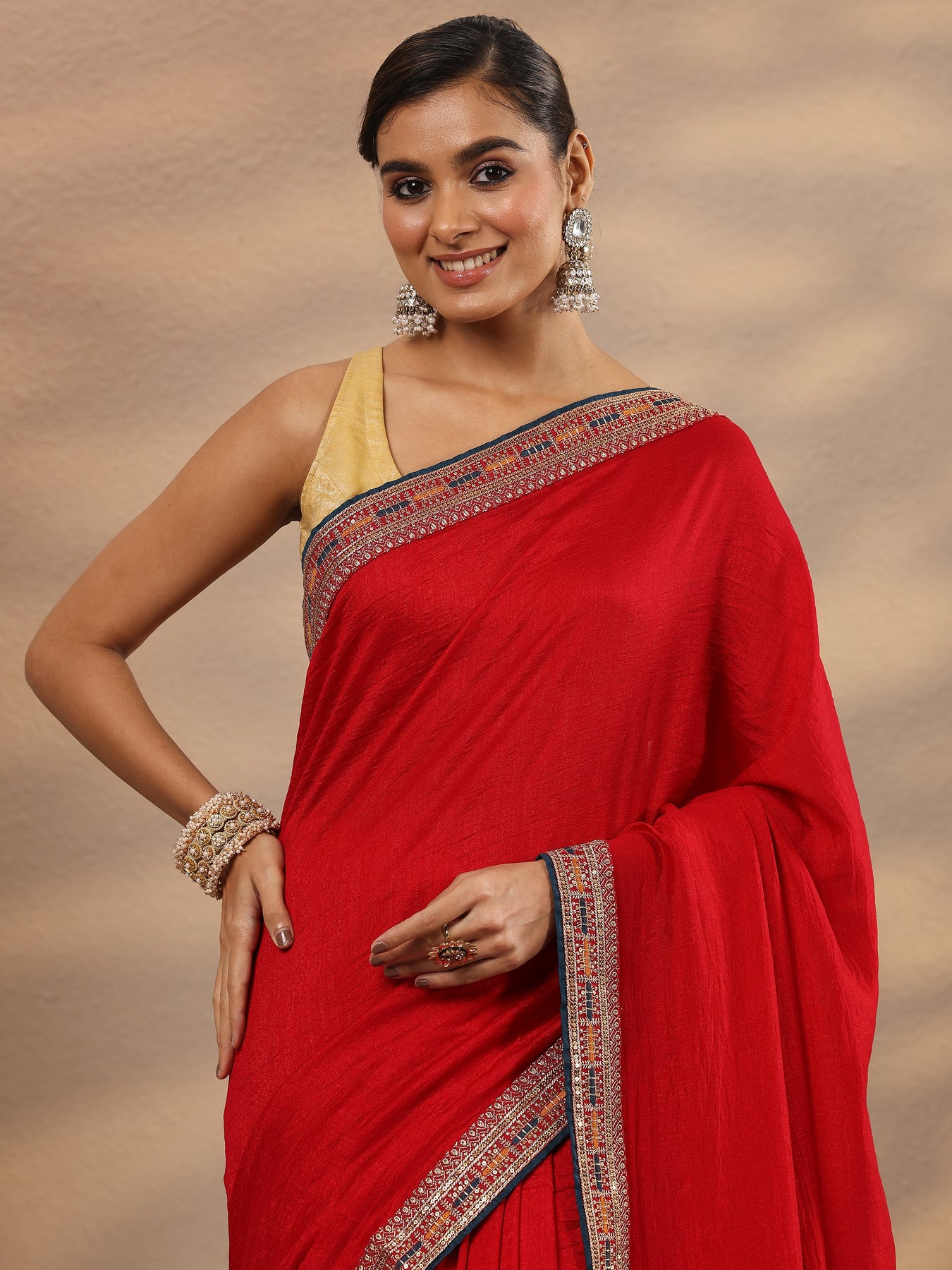 Our Red Solid Sarees Silk Blend Saree Features Captivating Solid. Complemented With An Unstitched Blouse Piece. This Charming Saree Is Perfect For Festive Occasions.