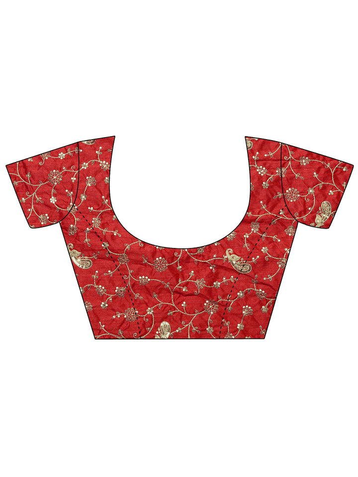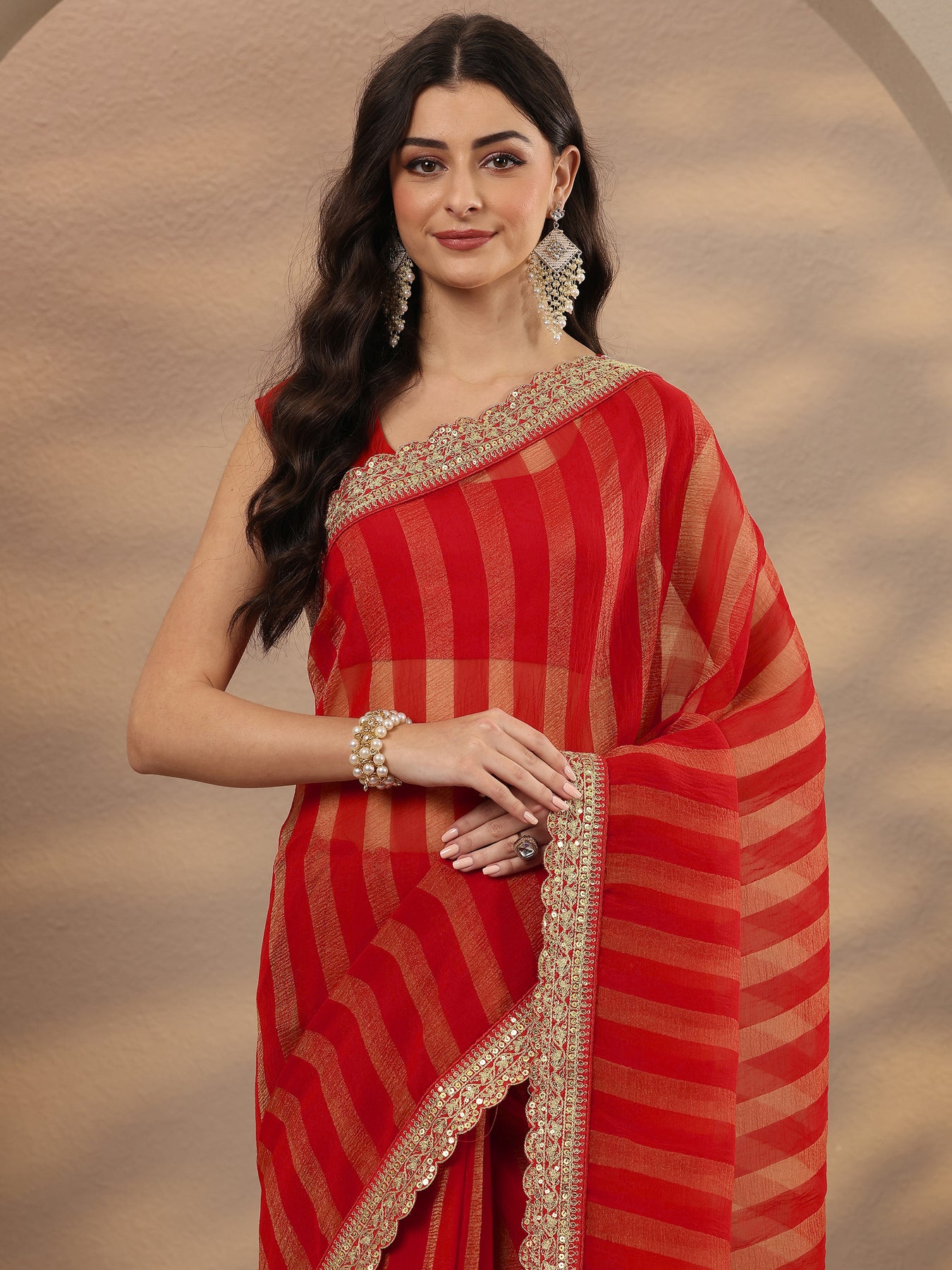 Our Red Embroidered Silk Blend Saree Features Captivating Striped. Complemented With An Unstitched Blouse Piece. This Charming Saree Is Perfect For Festive Occasions.