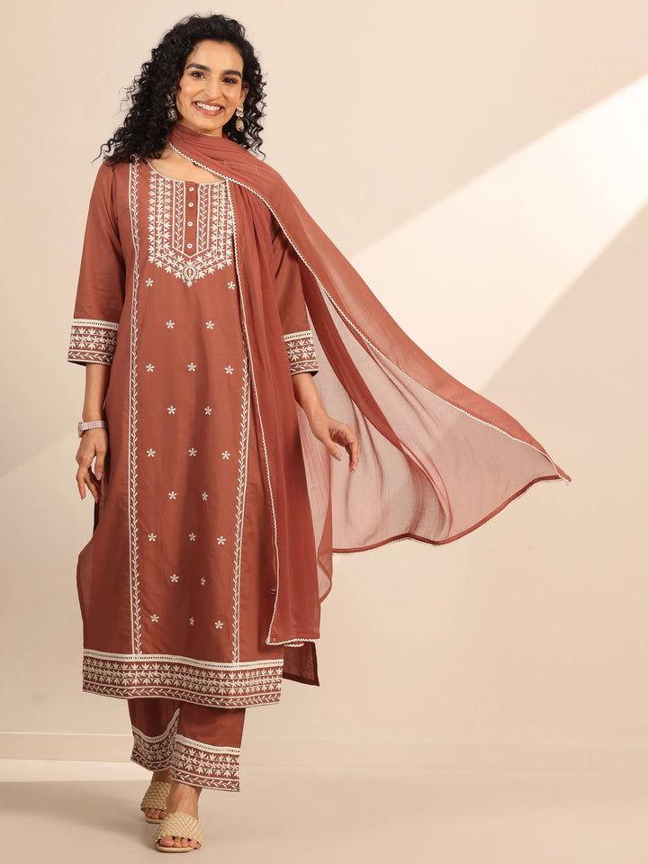 Rust Embroidered Cotton Straight Suit Set With Dupatta