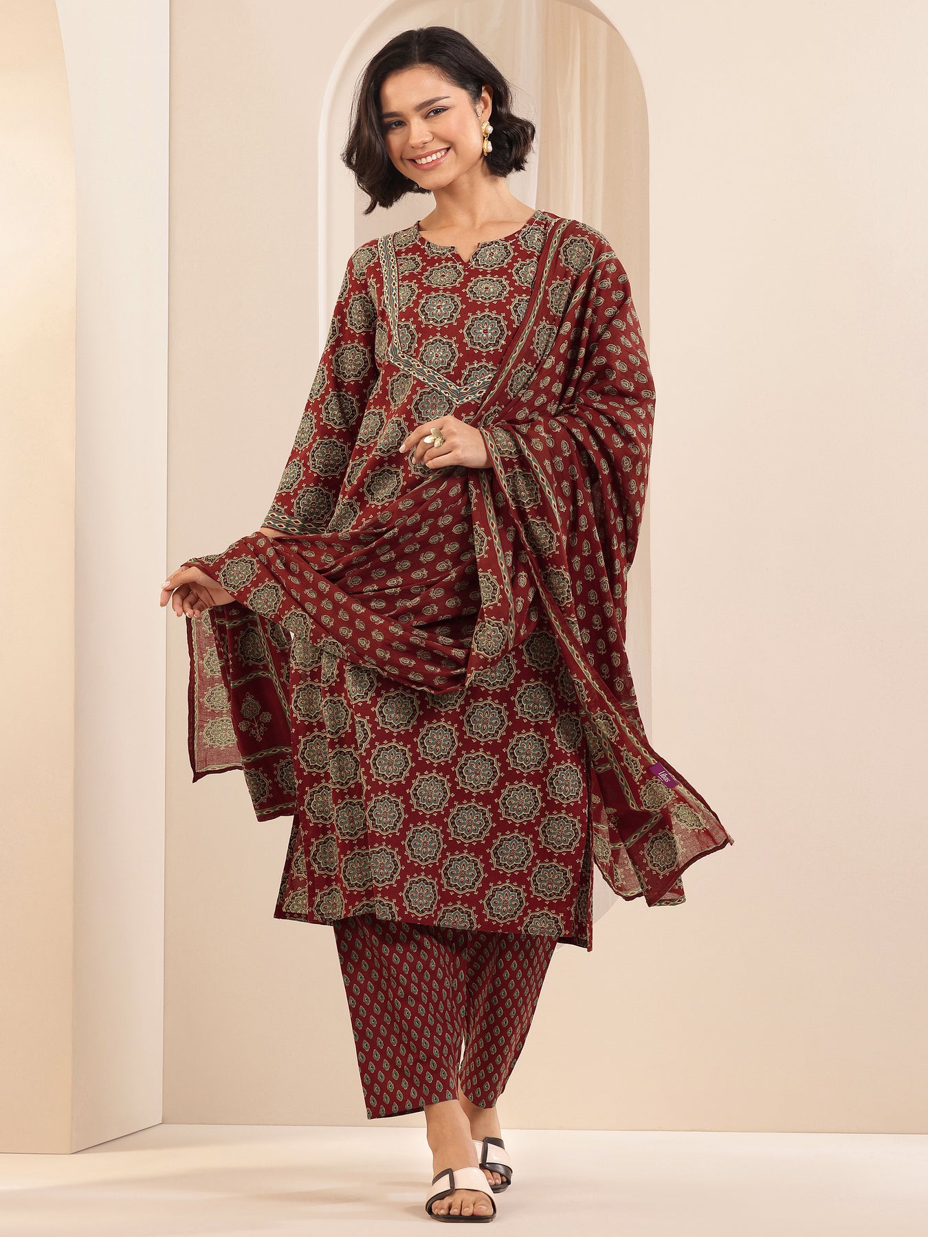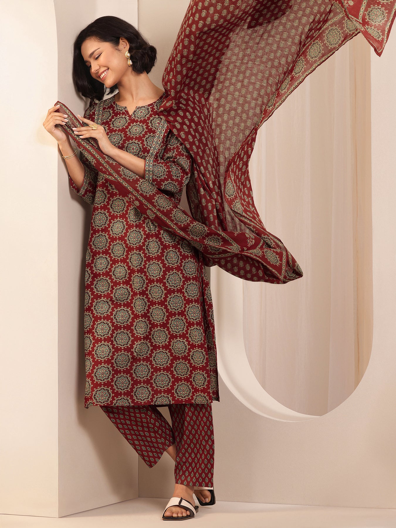 Our 3-piece green and maroon cotton suit set features a straight-fit kurta with a notched neckline, regular sleeves, and a statement yoke. Complemented with straight pants with an elasticated waistband and a block printed dupatta. Adorned with block printed motifs, this style is perfect for casual occasions.