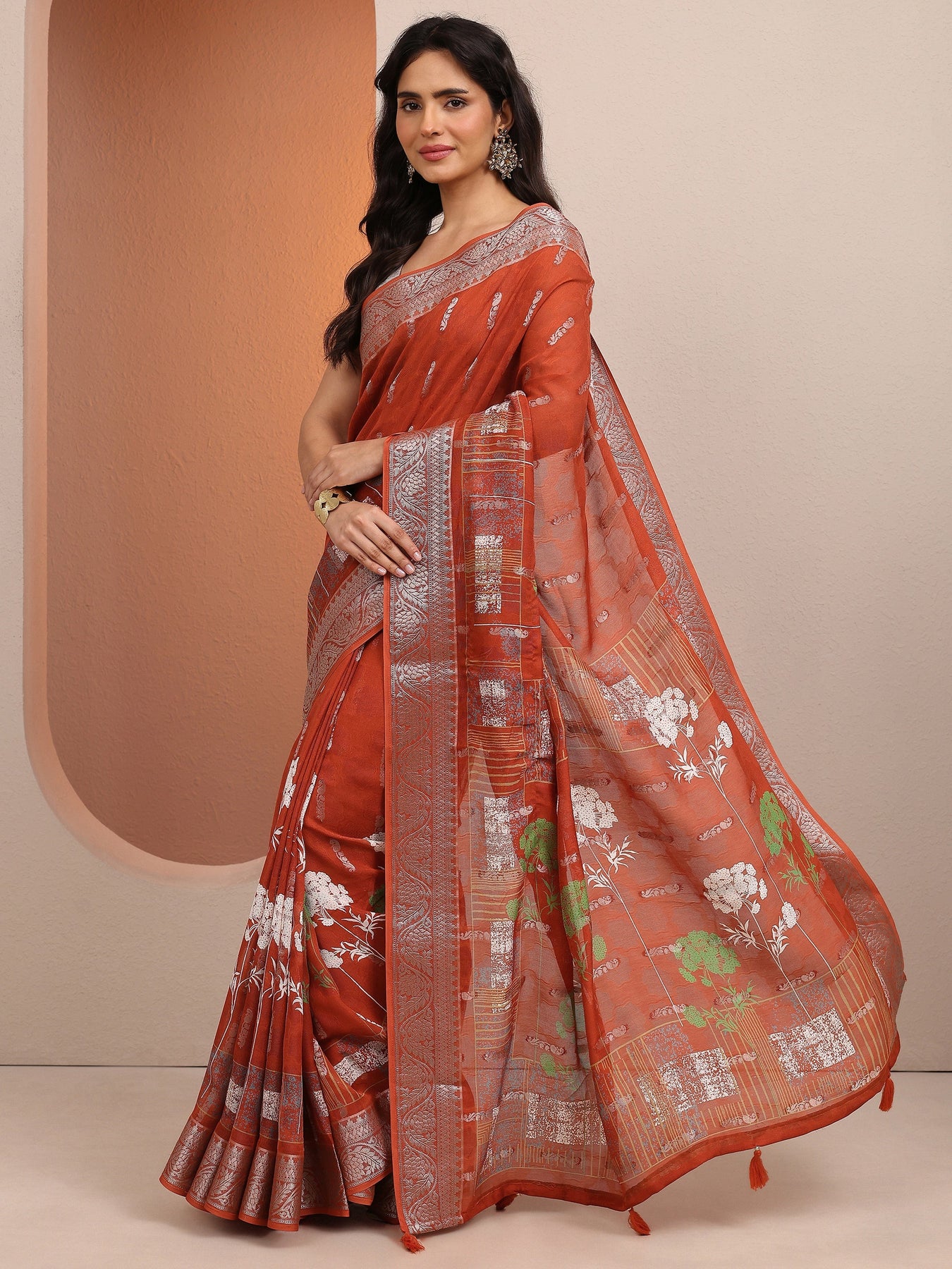Rust Printed Silk Blend Saree With Unstitched Blouse Piece